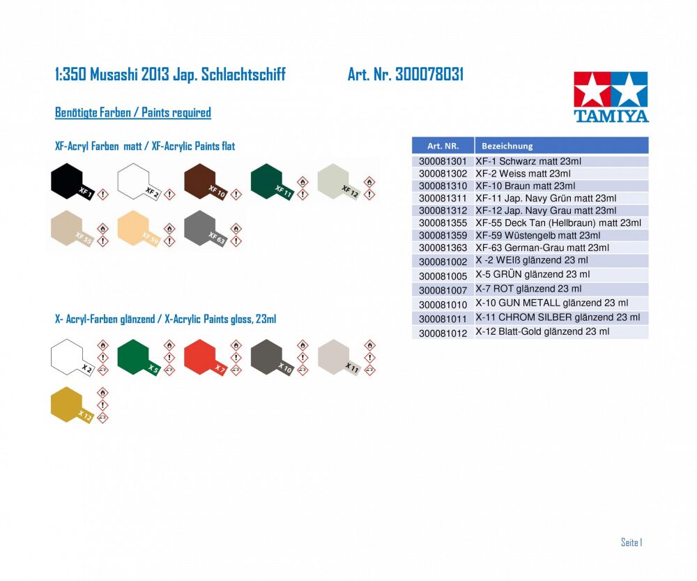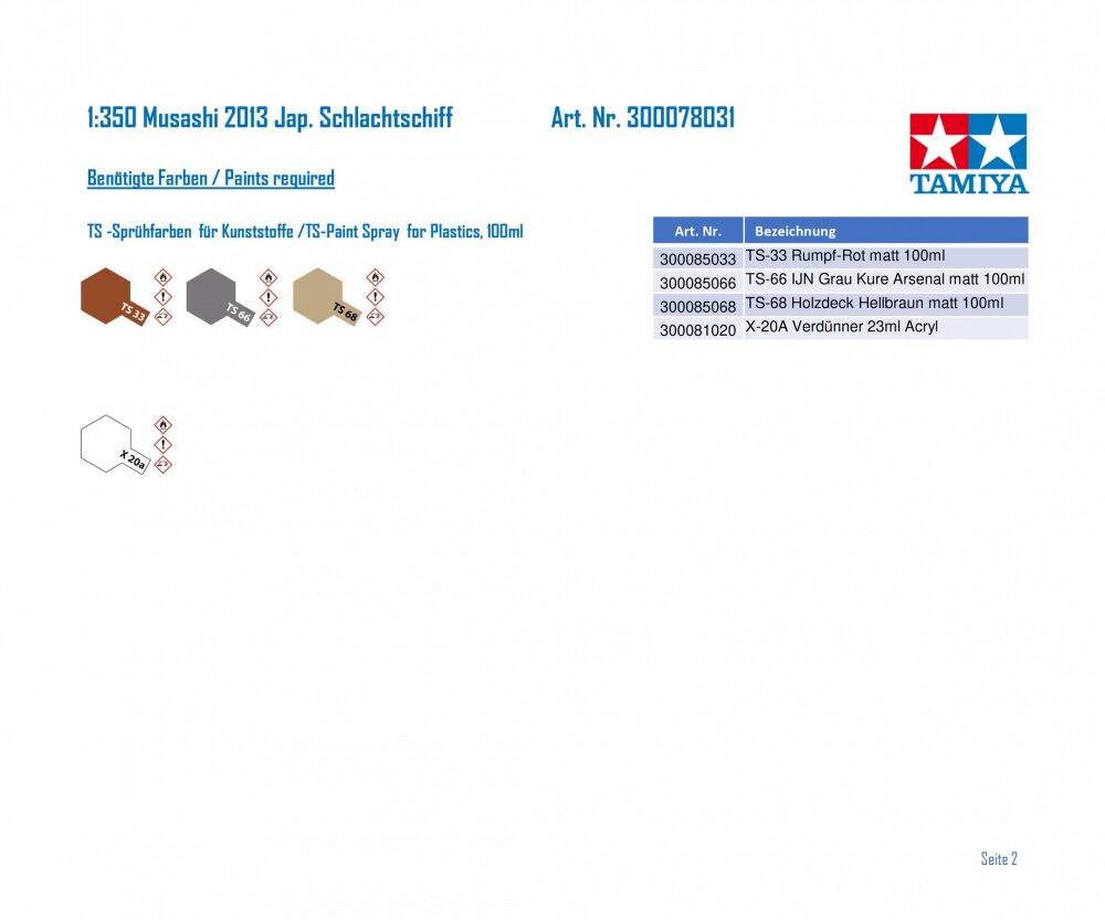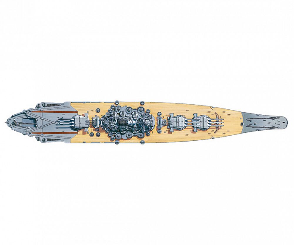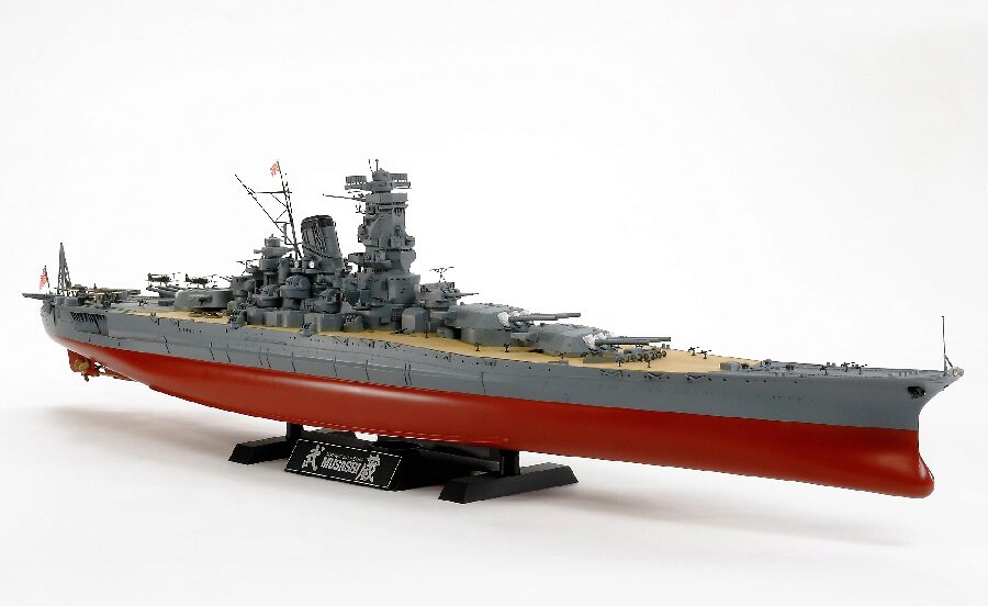 Das Standmodell ist eine Nachempfindung des größten Schlachtschiffs, welches jemals gebaut wurde und aus der Yamato-Klasse stammte, mit dem Namen Musashi. Die 1942 fertiggestellte Musashi nahm an verschiedenen Kampagnen teil, bevor sie schließlich in der Schlacht am Golf von Leyte ihrem Schicksal durch Flugzeuge der US-Marine erlegen war. Die TAMIYA Modellbau-kastenversion besticht durch Passgenauigkeit als auch durch detailreiche Wiedergabe wie beispielsweise eine Flugabwehrsuite, welche mit zahlreichen einzelnen 25-mm-Kanonen auf dem Hauptdeck ausgestattet war.