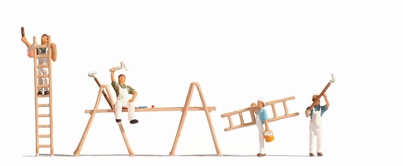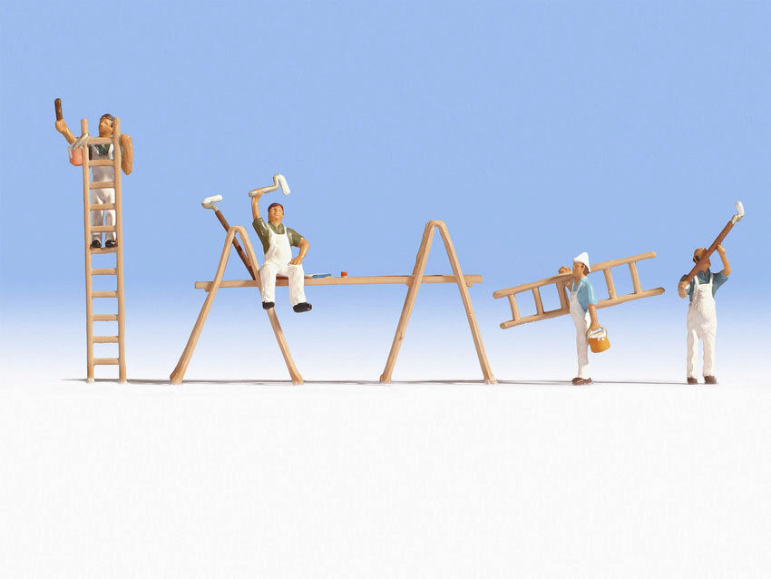 Das Set von NOCH umfasst vier Malerfiguren mit dem passenden Zubehör. Die detaillierten Figuren stellen verschiedene Arbeitsszenen dar: Ein Maler hat ein Gerüst erbaut, um auch höhere gelegene Bereich zu streichen. Ein anderer steht auf einer langen Leiter, während ein weiterer Arbeiter eine Leiter trägt streicht sein Kollege die Fassade mit einem langen Pinsel.