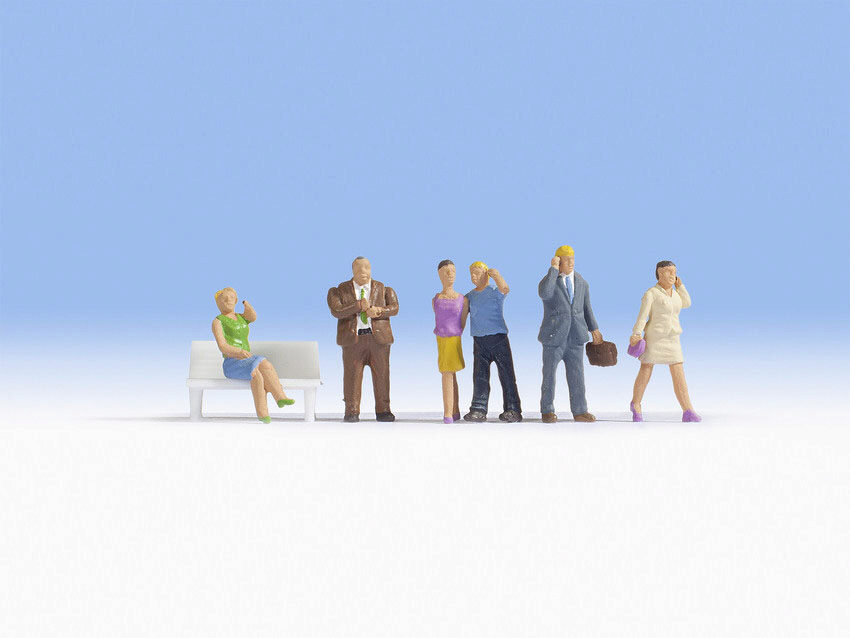 Das Set für die Spur H0 (Maßstab 1:87, ca. 2 cm hoch) enthält sechs Figuren mit einem Handy in der Hand.