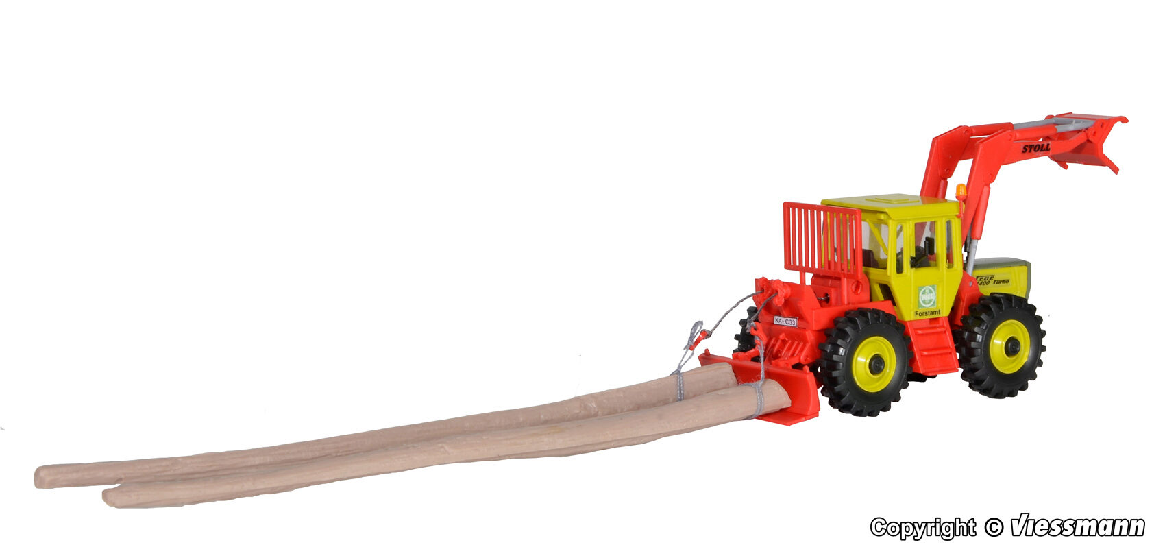 Bausatz. Vorbilddaten: Die Doppeltrommelwinde 8002 TL der Firma IGLAND hat eine Zugkraft von 2 x 8 t und eine max. Seilkapazität von 2 x 107 m bei einem Seildurchmesser von 12 mm. Bei einem Leistungsbedarf von 53 PS pro Trommel ist der MB TRAC genau der richtige Schlepper, um diese Winde anzutreiben. Da die Winde nur in den Heckkraftheber eingehängt wird, kann der Schlepper auch weiterhin in der Landwirtschaft genutzt werden. Mit dem Polterschild, das an jeden Frontlader angebaut werden kann, wird das Holz auf dem Polterplatz nach Längen sortiert. 6 Baumstämme liegen dem Bausatz bei. Maße: L 8,5 x B 3 x H 4 – 6 cm. Schwierigkeitsgrad: 2 (Fortgeschrittene).