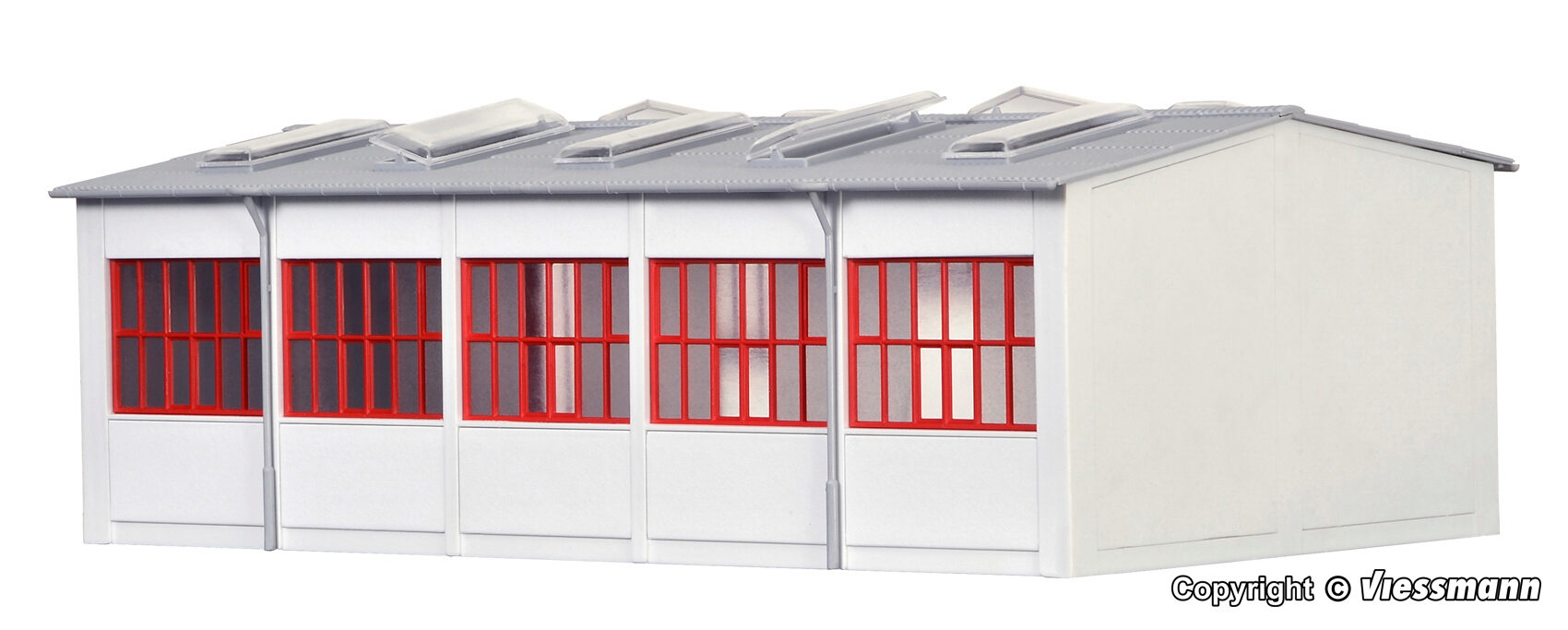 Bausatz. Mit einem 2. Bausatz ist die Halle nach hinten verlängerbar. Mit Stecksystem. Maße: L 34,5 x B 20 x H 11,5 cm. Schwierigkeitsgrad: 2 (Fortgeschrittene).
