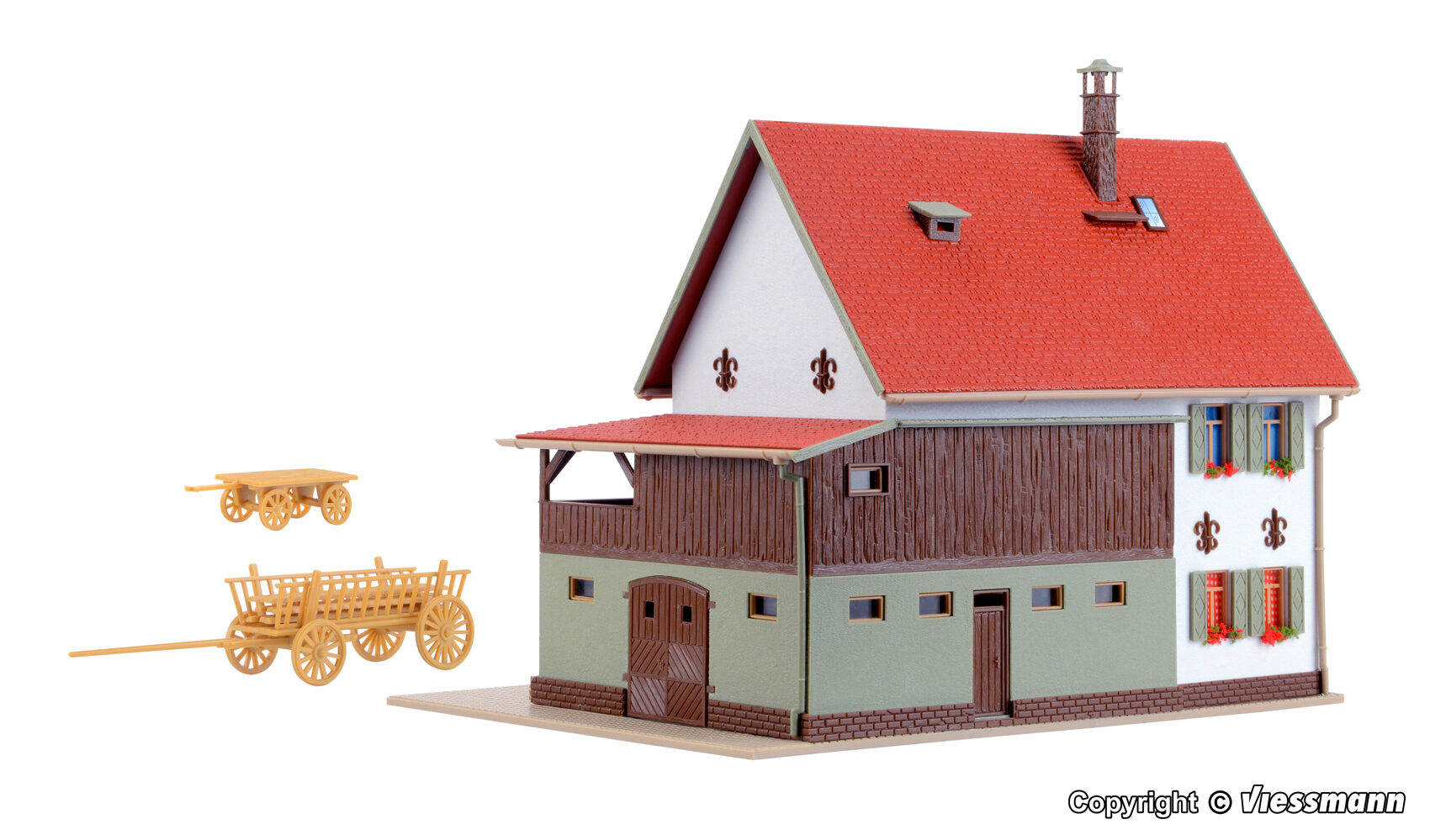Liebevoll gestaltetes Bauerngehöft mit Scheune. Zum Bausatz gehören außerdem ein großer und ein kleiner Leiterwagen. Maße: L 16 x B 12,3 x H 13,3 cm.