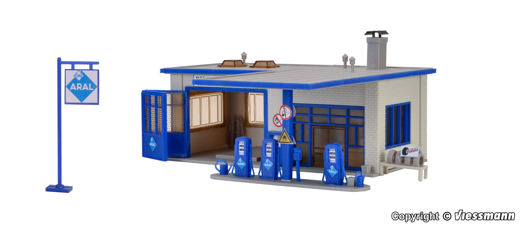 An dieser nostalgischen ARAL-Tankstelle mit integrierter Werkstatt herrscht reges Treiben. Man fühlt sich in die Zeit der 50er und 60er Jahre versetzt. Freundliche Tankwarte sind beim Tanken behilflich und in der Werkstatt wird gleich repariert. Tankstelle mit Zapfsäulen, Verkaufs- und Werkstattraum und vielen weiteren Details. Wir bedanken uns für die freundliche Unterstützung der BP Deutschland und des Historischen Archivs BP/ARAL. Maße: L 17,5 x B 14,7 x H 8 cm.