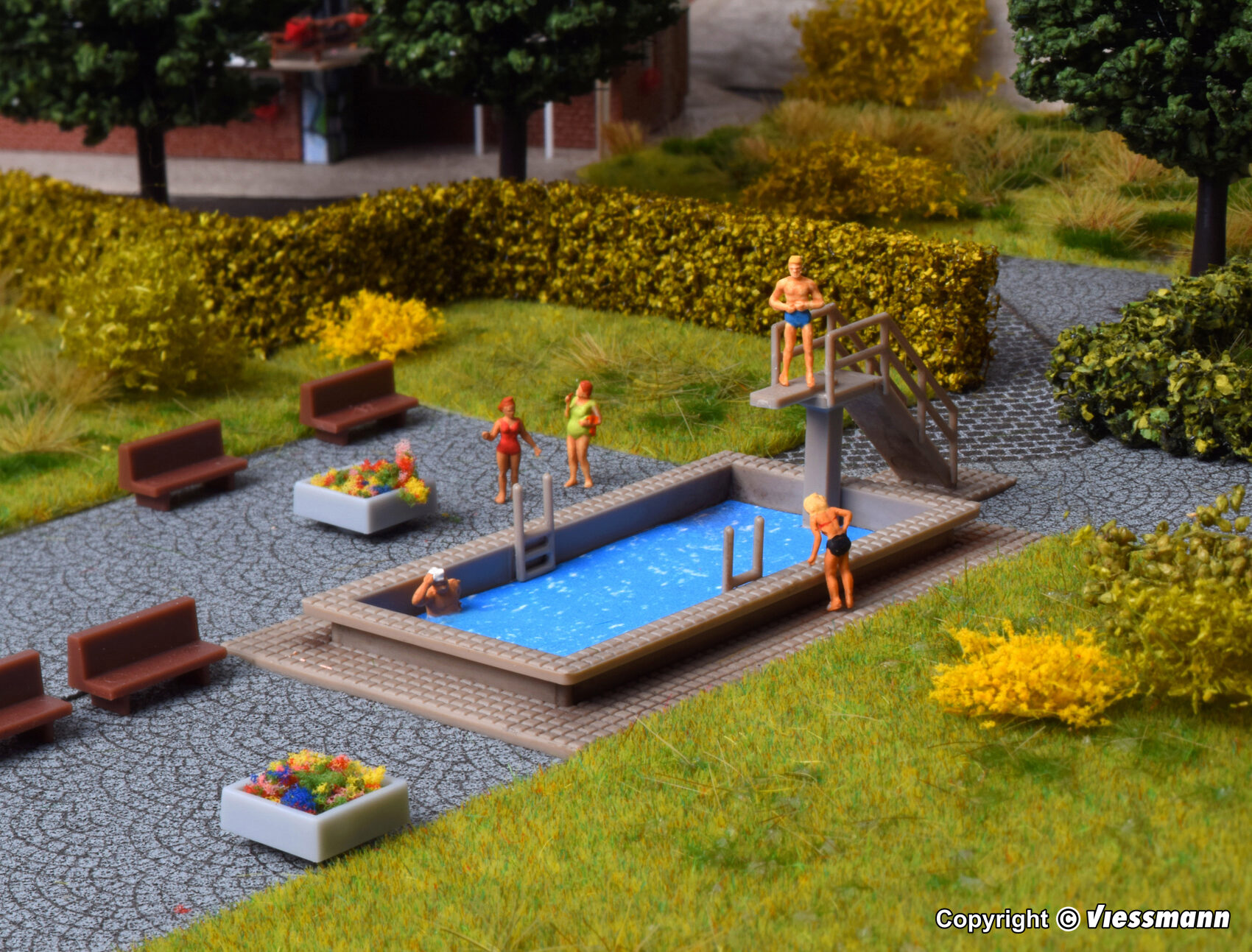 Dieses Schwimmbad mit Sprungturm ist die ideale Ergänzung zu Art. 47667 N Sport- und Wellnesshotel Europa oder es kann ganz separat eingebaut werden, z. B. als kleines Gemeindeschwimmbad oder Ähnliches. Maße: L 8,5 x B 4 x H 2,2 cm.