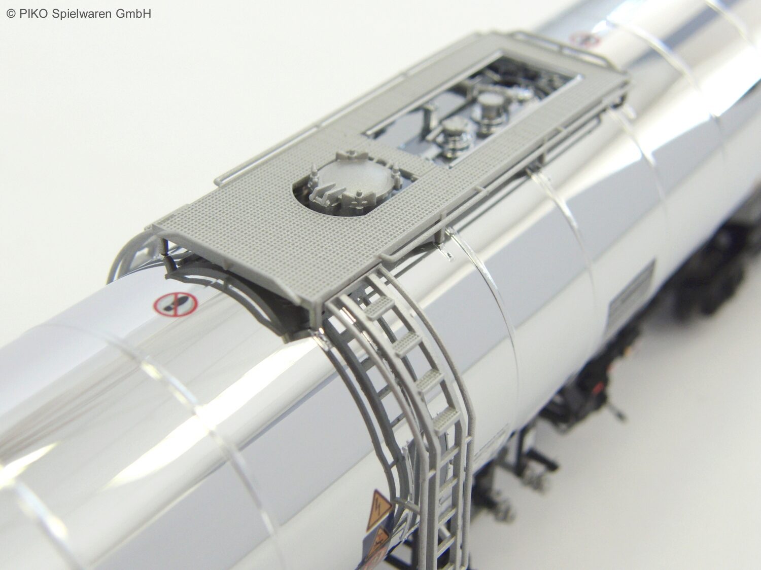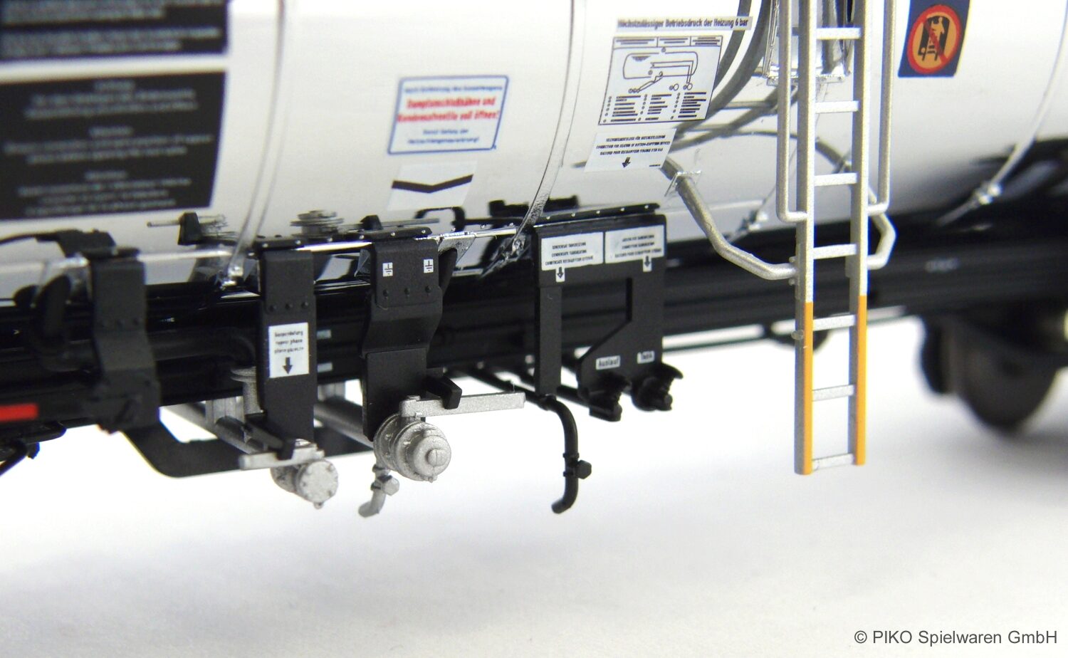 Die detaillierte Neukonstruktion punktet durch die vorbildnahe Darstellung der hochglänzenden Kesseloberfläche im perfekten Finish sowie der vielen freistehenden Kessel- und Bremsleitungen. Eine lupenreine und vorbildgerechte Bedruckung ist dabei selbstverständlich. Eingestellt bei der VTG, der Wagen eignet sich hervorragend für den Ganzzugeinsatz.