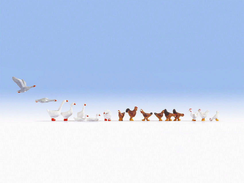 Das 17-teilige Set für die Spur H0 (Maßstab 1:87, ca. 2 cm hoch) besteht aus 11 Gänsen und 6 Hühnern. Das detailreiche Set zeigt die Tiere in unterschiedlichen bewegten Posen: einige fliegen, andere stehen oder sitzen. Sowie sie auch vor sich hin stolzieren oder Futter picken. Mit diesem Set lassen sich ideal landwirtschaftliche Szenen nachgestalten und lebendig ausschmücken!