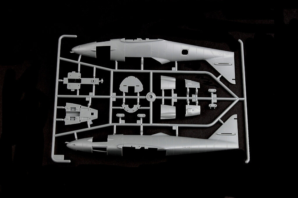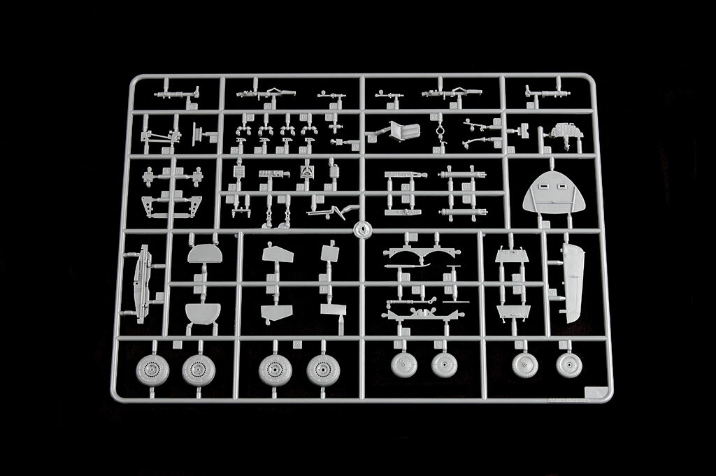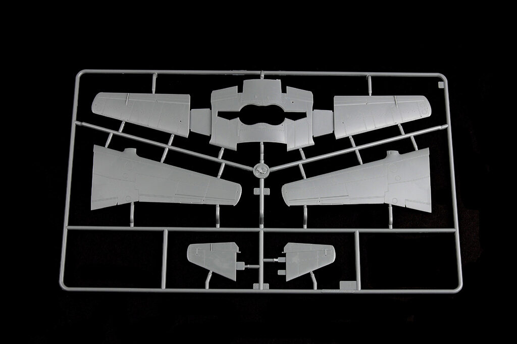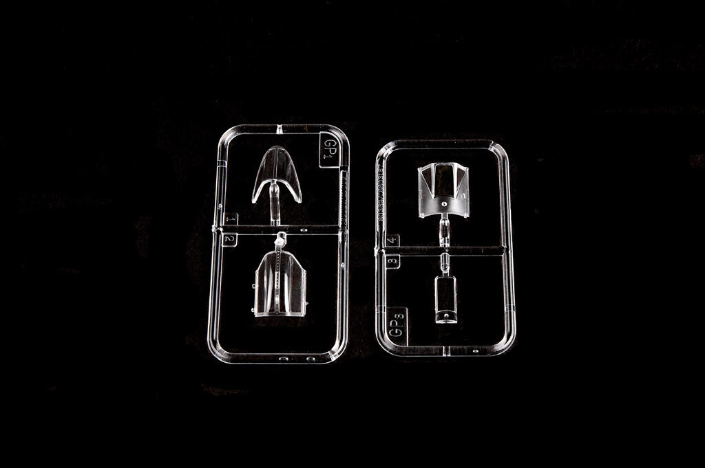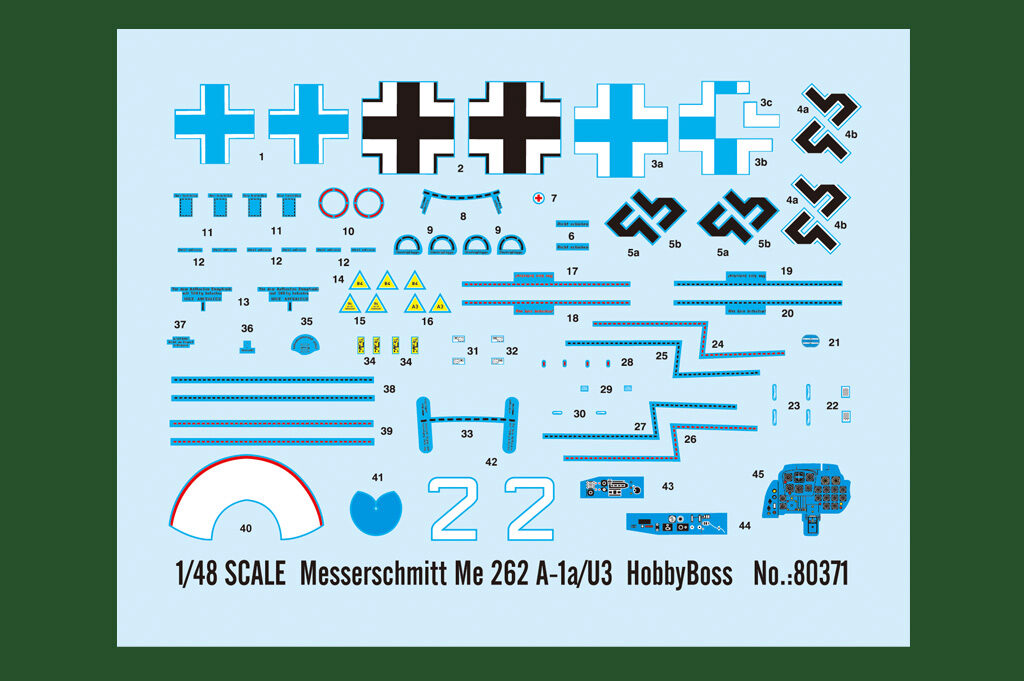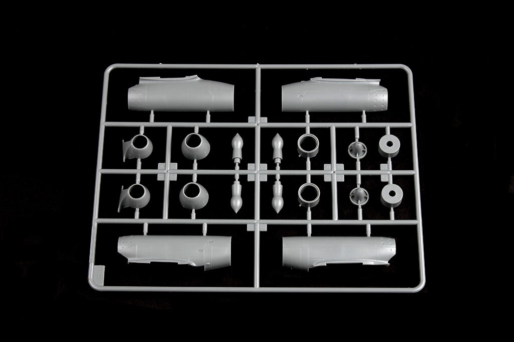 Plastikmodellbausatz eines deutschen WWII Turbinenjägers mit 179 Teilen und Metallteilen. Zwei Markierungen der Reichsluftwaffe möglich. Länge gebaut: 223 mm / Flügelspannweite: 260,6 mm.