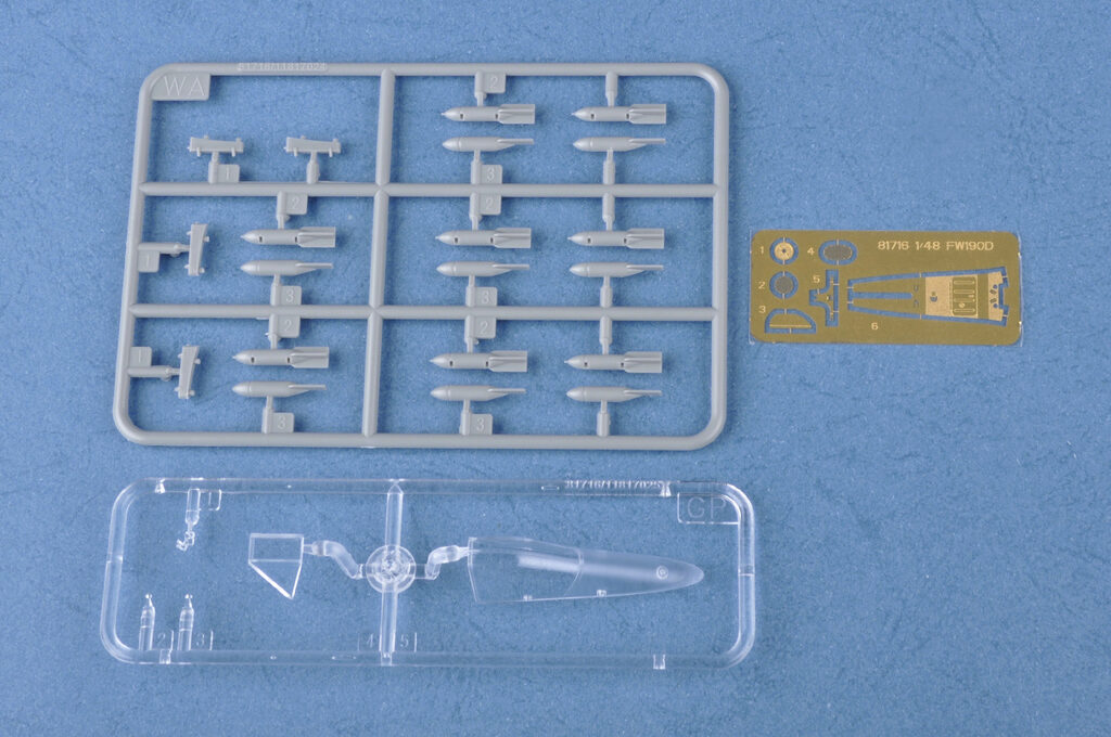 Plastikmodellbausatz eines deutschen WWII Jägers mit über 130 Teilen und Photoätzteilen. Länge gebaut: 213 mm / Flügelspannweite: 219 mm.
