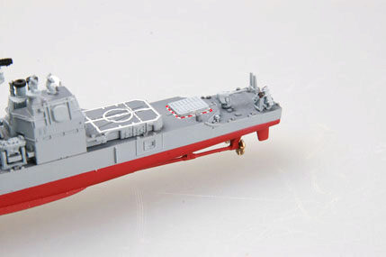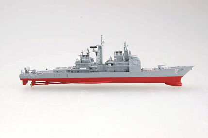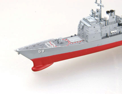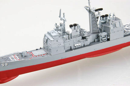 Plastikmodellbausatz eines US-amerikanischen Raketenkreuzers der Ticonderoga-Klasse aus den 1980er Jahren mit 35 Teilen und Ständer. Länge gebaut: 137,5 mm / Breite: 15 mm.