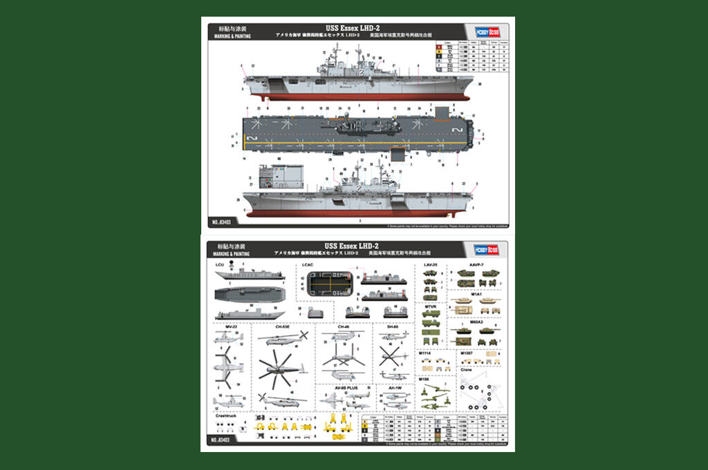 | More Features | The Hull is a one piece part - Detailed Flight Deck is a single piece casting - US Marine Assault Vehicles : M1A1×2,M60A3×2,AAV-7×2,M1097×2, MVTR×2,LAV-25×2,M198×2,M1114×2 , LCAC Hovercraft×2 and LCU Landing Craft×2 - Aircraft and Helicopters: AV-8B Harrier×2,CH-46E×4,CH-53E×4, MV-22 Osprey×4,AH-1W Cobra×2,SH-60F×2 - 3 pieces of Photo-Etched detailing parts for aisle,radar parts etc. |