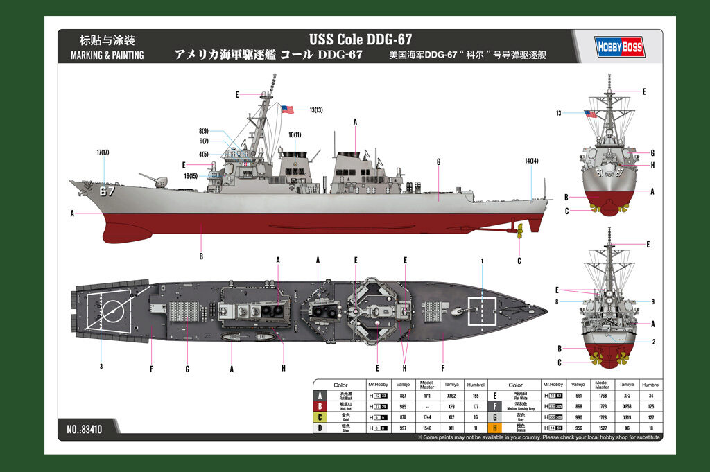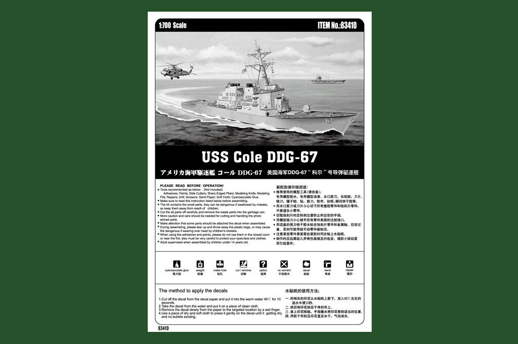 Plastikmodellbausatz eines modernen US-amerikanischen Kampfschiffes der Arleigh-Burke-Klasse. Mit über 180 Teilen und Photoätzteilen. Ständer liegt bei, ebenso 2 x SH-60B. Full-Hull oder Waterline baubar. Länge gebaut: 219,8mm / Breite: 32,5 mm.