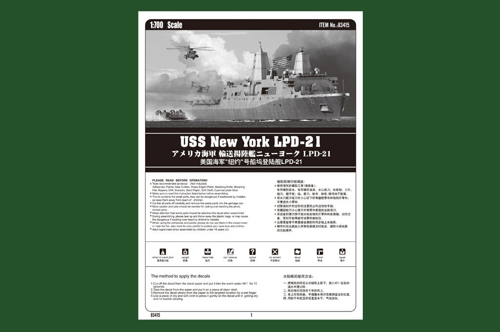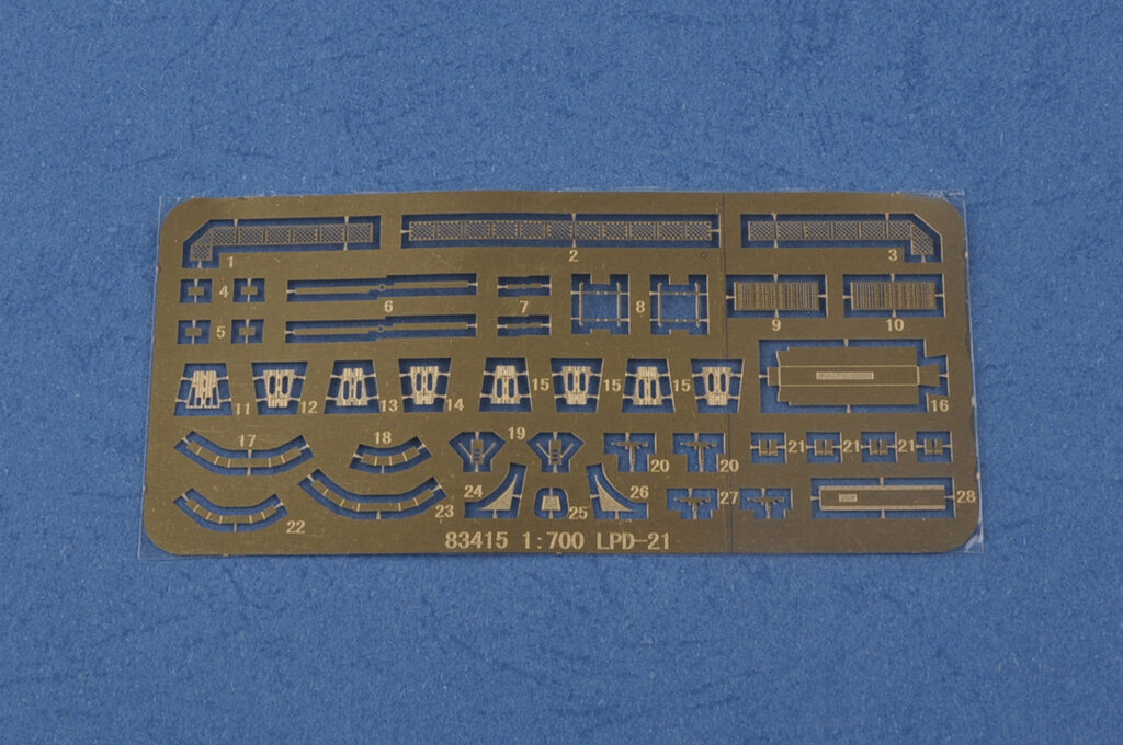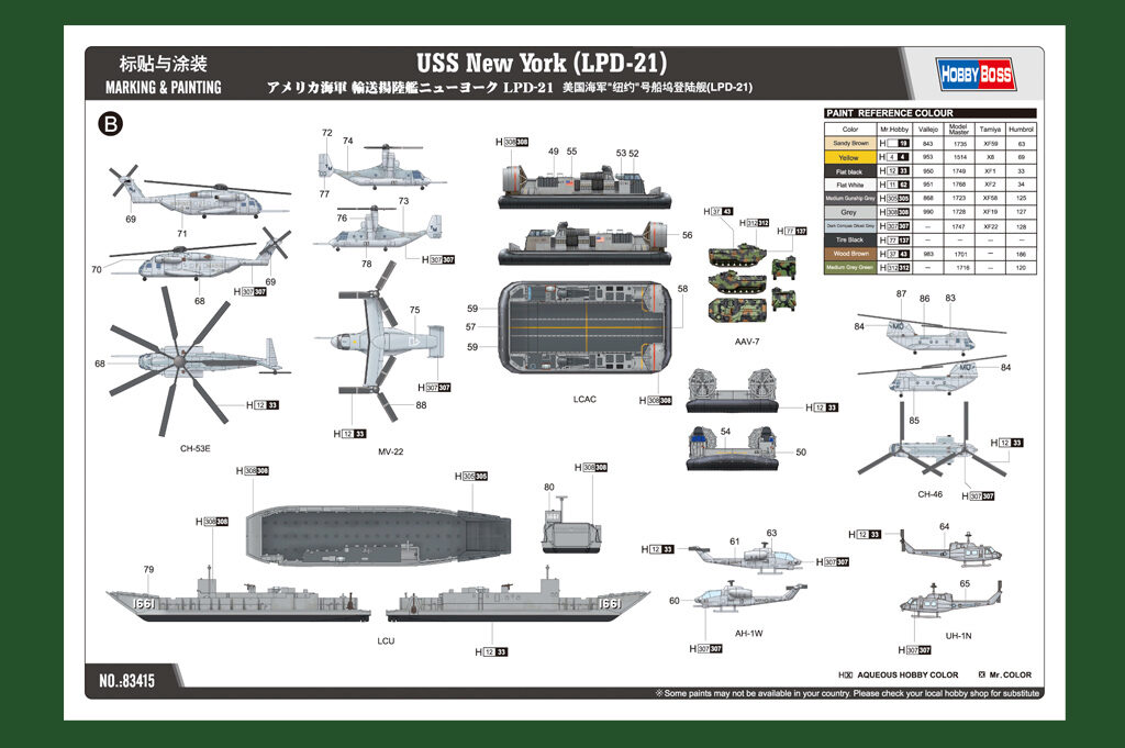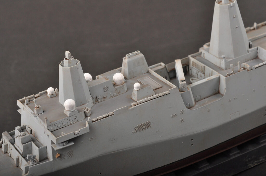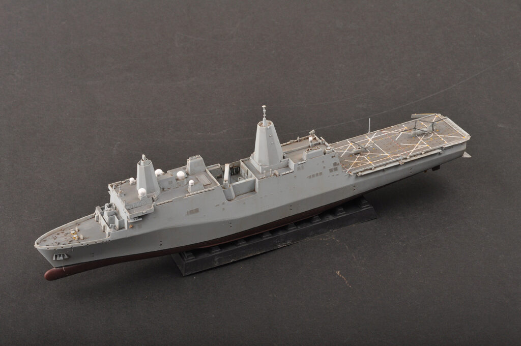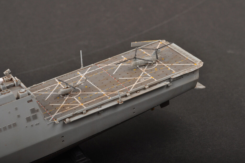 | More Features | - The Hull is a one piece part with exception of the bulbous nose - Detailed Flight Deck,Hanger Deck and Well Deck: - US Marine Assault Vehicles : AAV-7×2 LCAC Hovercraft×2 and LCU Landing Craft×1 - Aircraft and Helicopters: CH-46E Sea Knight×2,CH-53E Super Stallion×2, MV-22 Osprey×2,AH-1W Cobra×2,UH-1N Iroquois×2 - Photo-Etched parts included |