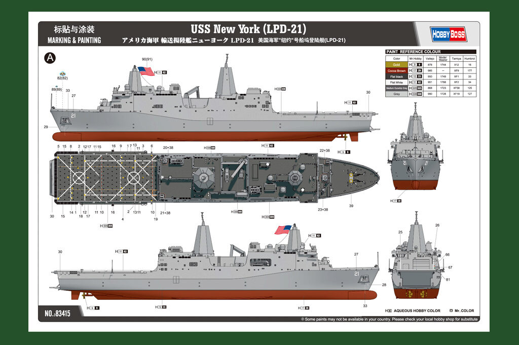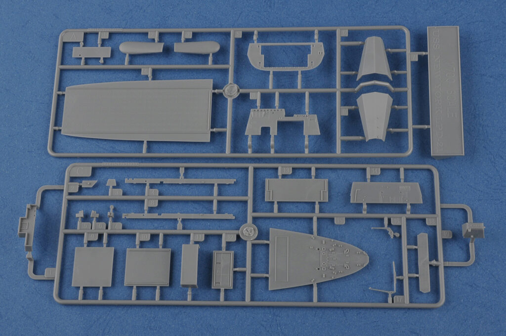 Plastikmodellbausatz eines modernen US-amerikanischen Zerstörers mit über 360 Teilen und Photoätzteilen. Ständer liegt bei, ebenso verschiedene Kleinschiffe, Hubschrauber und Flugzeuge. Länge gebaut: 298,2 mm / Durchmesser: 45,5 mm.