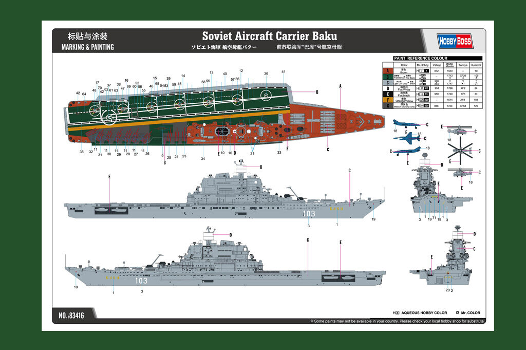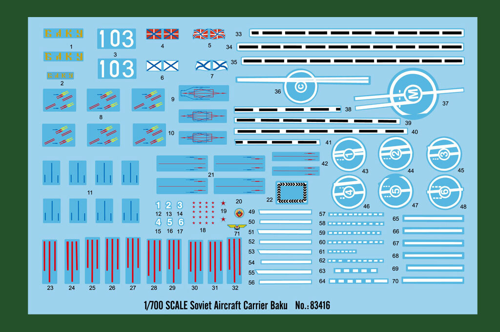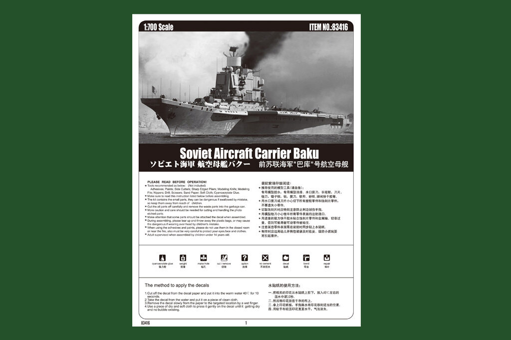 | More Features | - upper hull made from multi-directional slide moulds. - Separate sonar due to her sphere. - 4 Ka-27 & 4 Yak-38 included - Photo-etched included |
