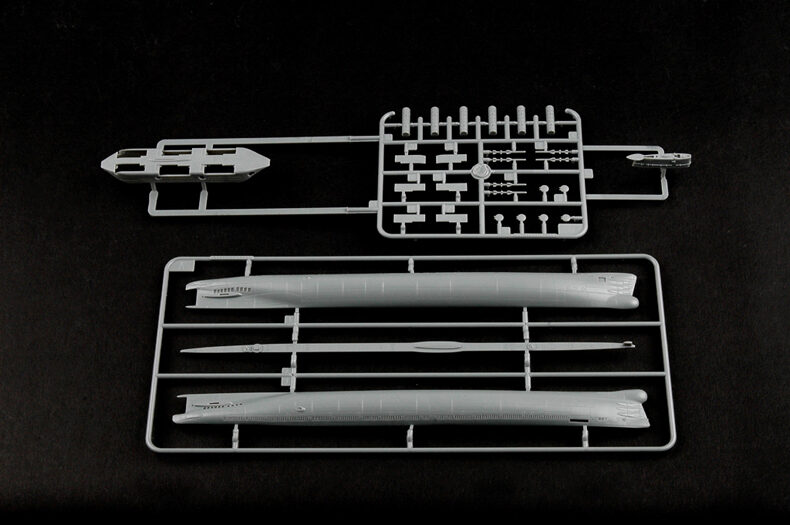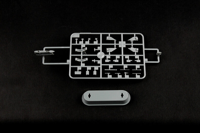 Plastikmodellbausatz eines chinesischen U-Bootes der 1960er Jahre mit über 70 Teilen und Photoätzteilen. Länge gebaut: 218,8 mm / Durchmesser: 20 mm.