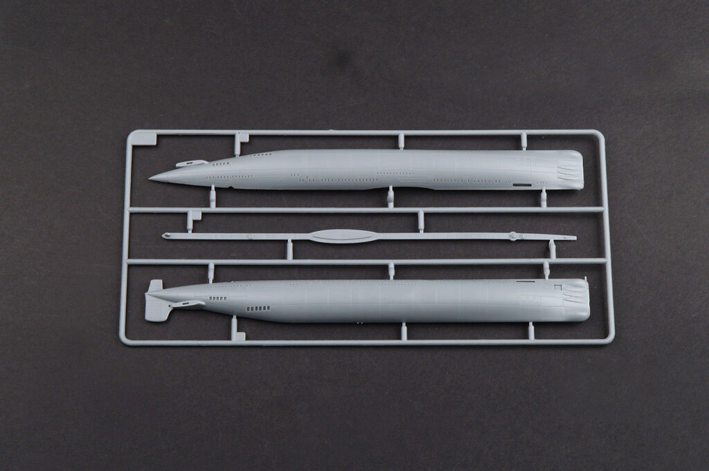 Plastikmodellbausatz eines chinesischen U-Bootes der 1990er Jahre mit über 30 Teilen und Photoätzteilen. Ständer liegt bei. Länge gebaut: 217,1 mm / Durchmesser: 21,7 mm.