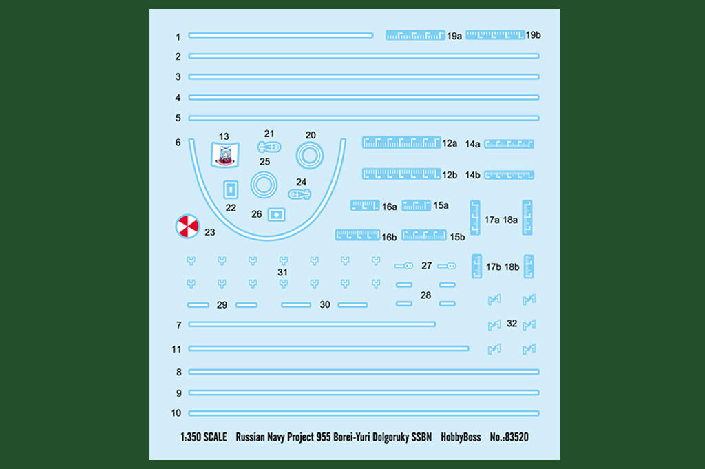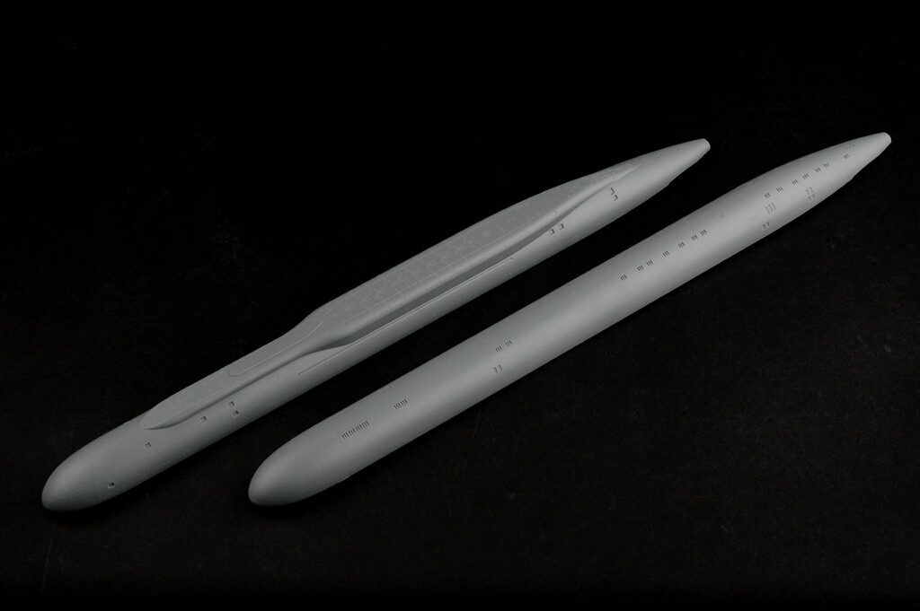 Plastikmodellbausatz eines russischen Atom-U-Bootes mit 30 Teilen und Photoätzteilen. Ständer liegt bei. Länge gebaut: 485,7 mm / Durchmesser: 61,1 mm.
