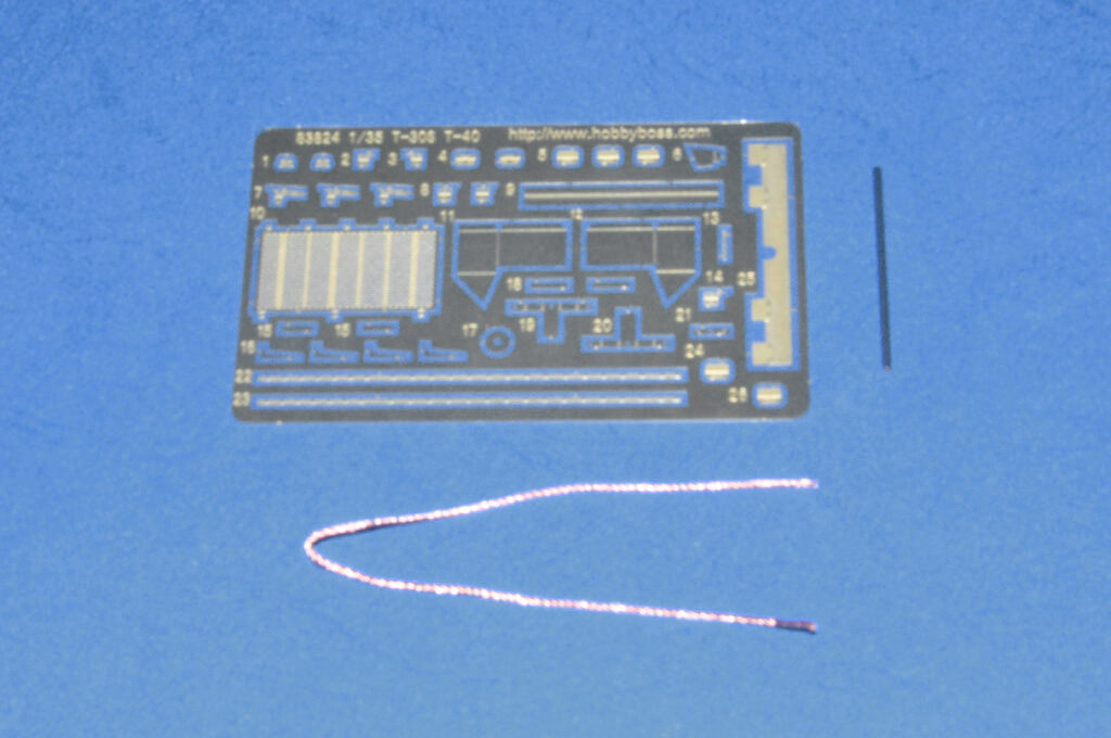 Plastikmodellbausatz eines leichten russischen Panzers mit über 300 Teilen. Photoätzteilen und einzelnen Kettengliedern. Länge gebaut 110 mm / Breite 65,5 mm.