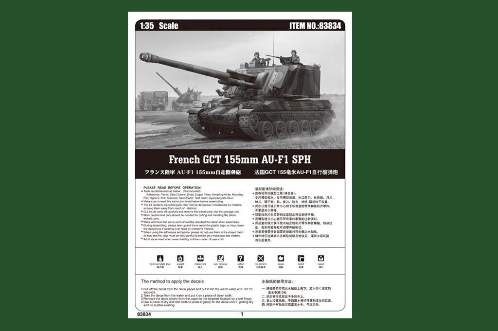 Plastikmodellbausatz eines französischen Artilleriefahrzeuges aus den 1970er Jahren. Mit über 450 Teilen, Metallteilen und Photoätzteilen. Länge gebaut: 302,5 mm / Breite: 97,2 mm.