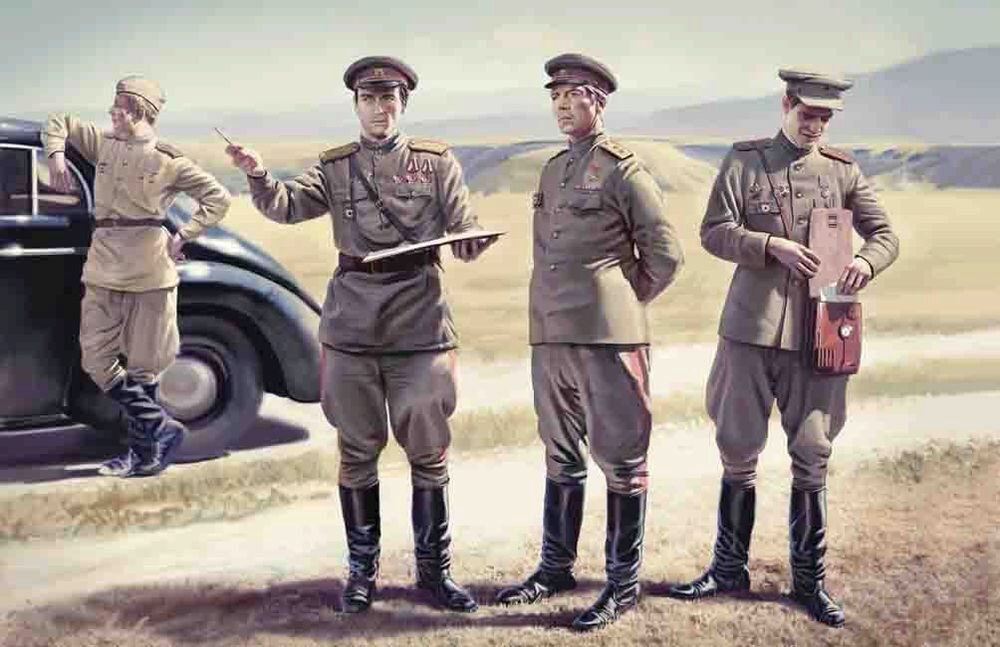 Plastikmodellbausatz für Figuren des 2. Weltkrieg: Sowjetisches Stabspersonal: (1939-1945). Plastikmodellbausatz für insgesamt 4 Figuren (2 Generale, Offizier und Fahrer), mit 36 Einzelteilen.