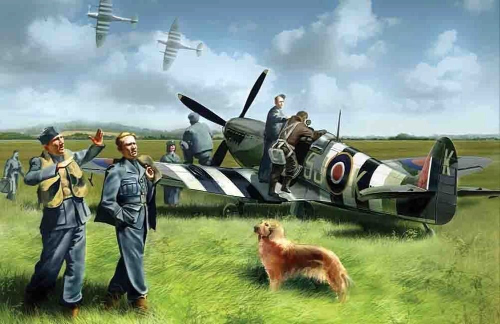 Plastikmodellbausatz eines britischen WWII Jagdflugzeugs. Inklusive sieben Figuren (drei Piloten, drei Mechaniker, ein Hund).