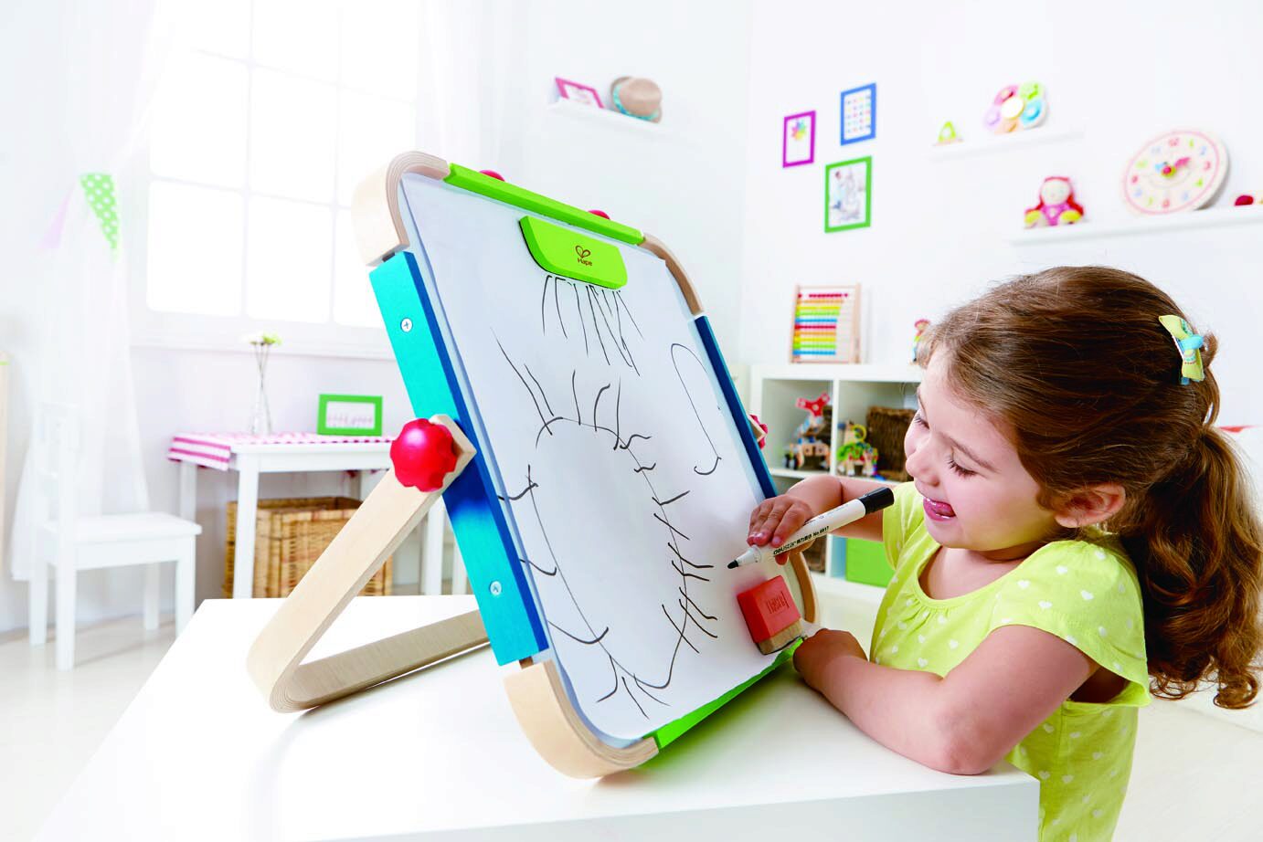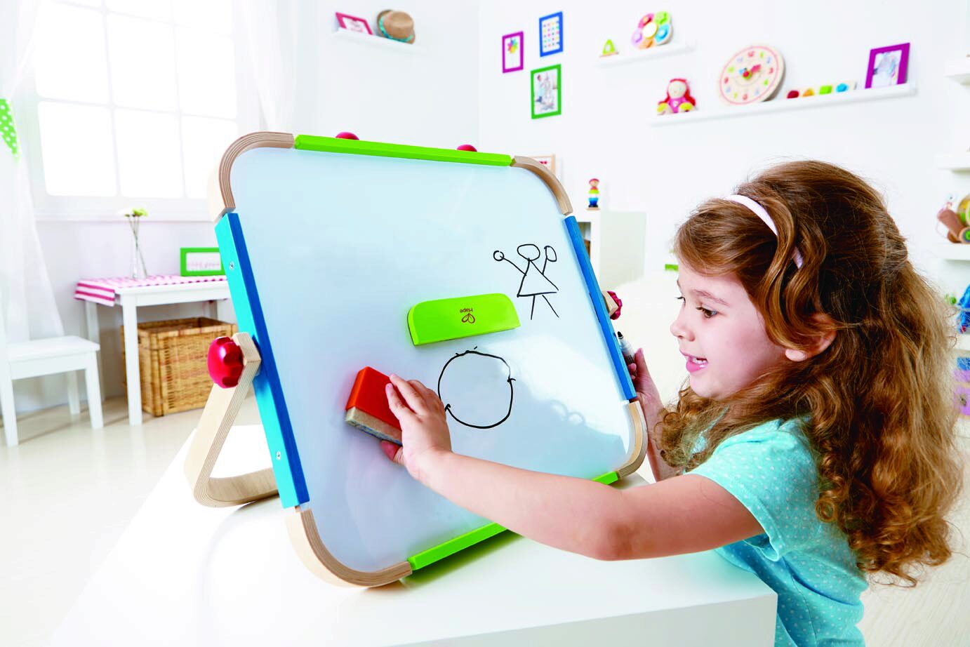 Dieses mobile Tisch-Atelier beschäftigt kleine Künstler mit einem Whiteboard, einer Tafel und magnetischen Formen, um mit viel Kreativität neue Kunstwerke zu erschaffen.