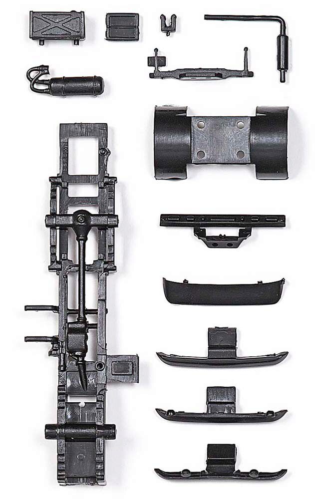 Das Zubehör-Set besteht aus allen Einzelteilen des langen 3700 mm Fahrgestells sowie einem Dachspoiler. Der Umbausatz ist perfekt zum Ergänzen von selbstgebauten Fahrzeugmodellen oder zum Aufrüsten alter W50-Modelle geeignet und wird farblich gemischt geliefert. Daher ist eine Lackierung in der gewünschten Farbgebung notwendig.