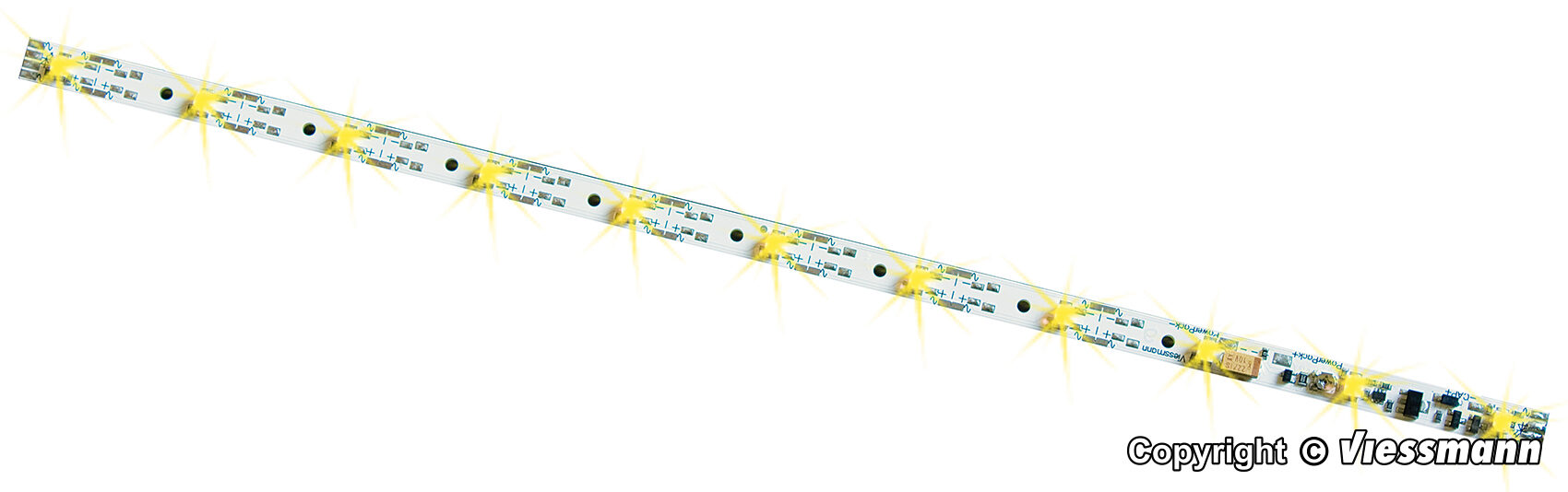Vielfach kürzbare Innenbeleuchtung mit 11 wartungsfreien, stromsparenden LEDs und hellem Licht. Helligkeit durch Potentiometer einstellbar. Geeignet für Waggons aller Hersteller, die für Beleuchtung vorgesehen sind. Befestigung der Platinen unter dem Waggondach. Durch Kürzen können die Platinen auf jede Waggonlänge angepasst werden. Flackerschutz und Konstantstromquelle für gleichbleibend helles Licht integriert. Die Stromversorgung erfolgt entweder durch am Waggon vorhandene Schleifer/Kontaktsätze oder durch unsere stromführenden Kupplungen Art. 5048/5071. Für Gleich-, Wechsel- und Digitalstrom geeignet. Anschlussmöglichkeit für Zugschlussbeleuchtung, z. B. Art. 5056. Stromaufnahme ca. 38 mA. Maße: L 25,4 x B 0,7 cm.