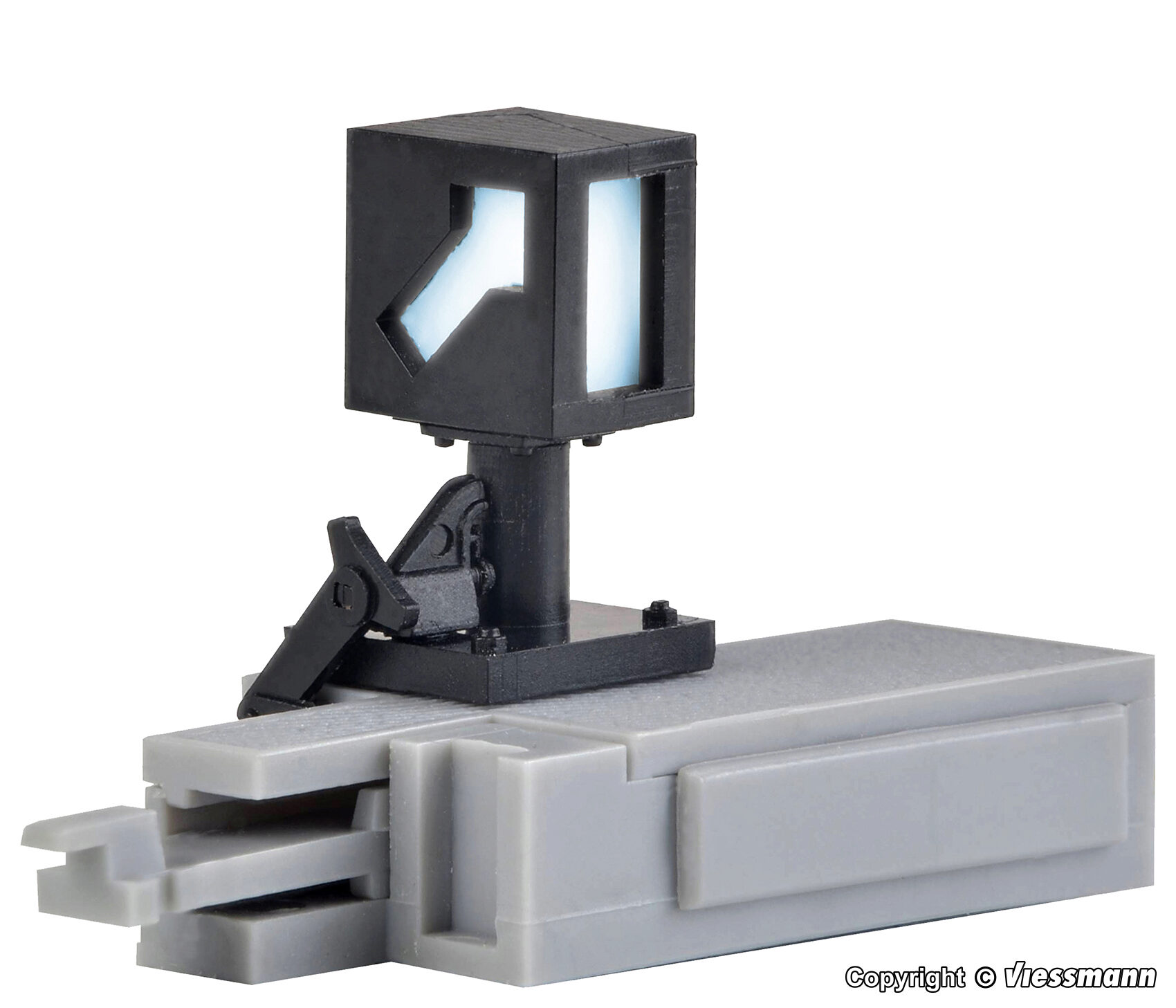 Diese Weichenlaterne wird über ihren zugehörigen Adapter an der Stirnseite des Universalantriebs Art. 4560 angebaut und verwendet dessen Längsabtrieb. Die Weichenlaterne wird von einer weißen LED beleuchtet, der Anschluss erfolgt über braun-gelbe Kabel. Enthalten ist je ein Lampengehäuse für Rechts- und Linksabzweig. Maße: L 2,9 x B 2 x H 0,53 cm.