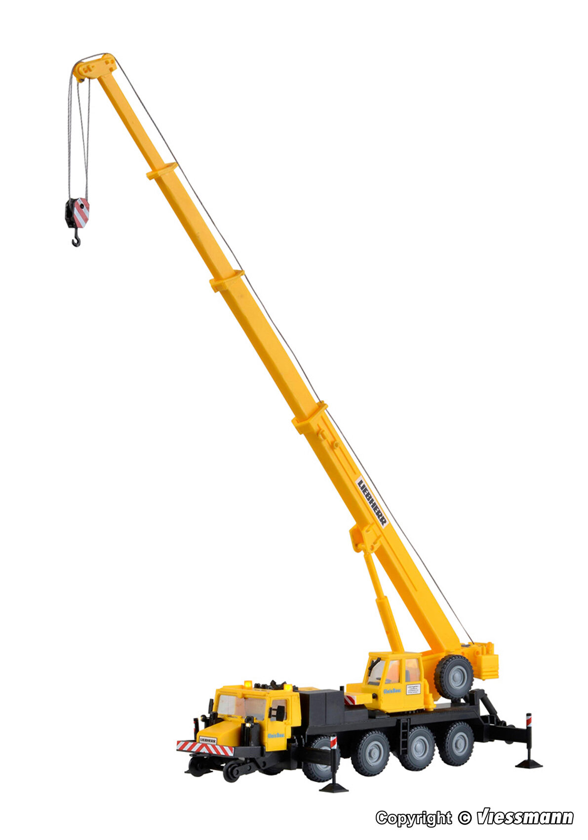 Funktionsbausatz. Mit vormontierten Front-, Heck- und 2 gelben Rundumleuchten. Vorbilddaten: LIEBHERR Mobilkran LTM 1050-4, 8 Zylinder Dieselmotor mit 260 kW/354 PS, max. Hublast 50 t, Gesamtgewicht 44 t. Das Modell ist mit hochwertiger Tampon-Bedruckung versehen. Maße: Fahrstellung L 14,5 x B 3,5 x H 4,5 cm, ausgefahren L 14,5 x B ca. 9 x H ca. 33 cm. Schwierigkeitsgrad: 2 (Fortgeschrittene).