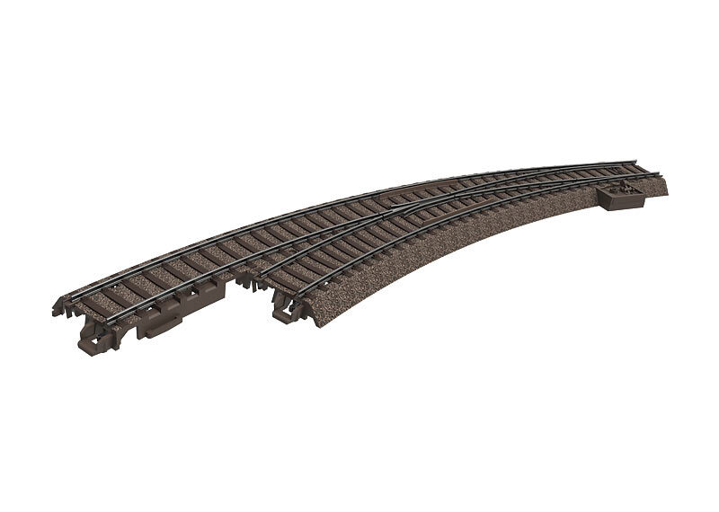 Innenbogen: R3 = 515 mm / 30°. Außenbogen: 30° im Parallelkreisabstand 64 mm. Mit Handschalthebel. Im Innenbogen der Weiche werden 2 Gleise 62315 benötigt, ein passendes Böschungsteil liegt bei. Metall-Herzstück polarisierbar. Elektroantrieb 74491, Digital-Decoder 74461 und Weichenlaternen 74470 nachrüstbar.