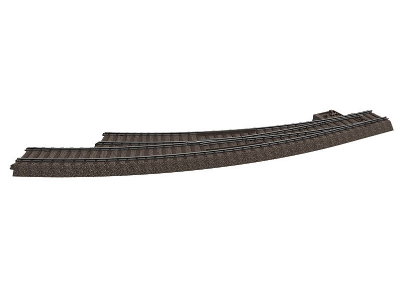 Innenbogen: R3 = 515 mm / 30°. Außenbogen: 30° im Parallelkreisabstand 64 mm. Mit Handschalthebel. Im Innenbogen der Weiche werden 2 Gleise 62315 benötigt, ein passendes Böschungsteil liegt bei. Metall-Herzstück polarisierbar. Elektroantrieb 74491, Digital-Decoder 74461 und Weichenlaternen 74470 nachrüstbar.