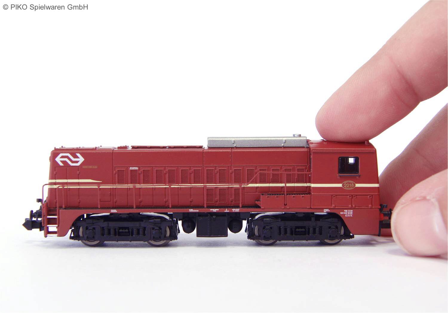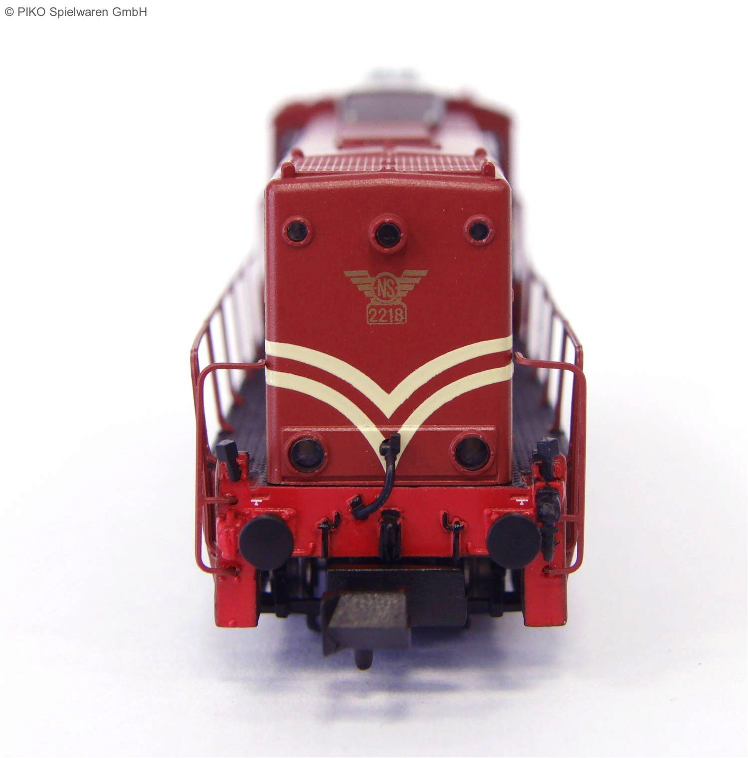 Das formneue Modell der NS 2218 in der Ausführung mit Schalldämpfer und drittem Spitzensignal besticht durch feinste Gehäusegravuren und Detaildarstellungen der schweren Drehgestelle. Bei den Geländern handelt es sich um aufwendig geätzte Metallteile. Der Motor, der über eine präzise ausgewuchtete Schwungmasse verfügt, treibt alle vier Achsen an und sichert dem Fahrzeug ausgezeichnete Laufeigenschaften bis zu Radien von nur 192 mm herab. Die beiden innen laufenden Achsen sind mit je einem Haftreifen versehen. Das Modell besitzt eine PluX-Schnittstelle und den üblichen Lichtwechsel rot/weiß.
