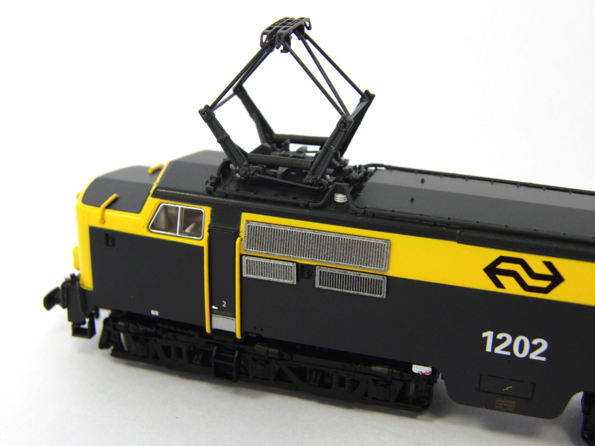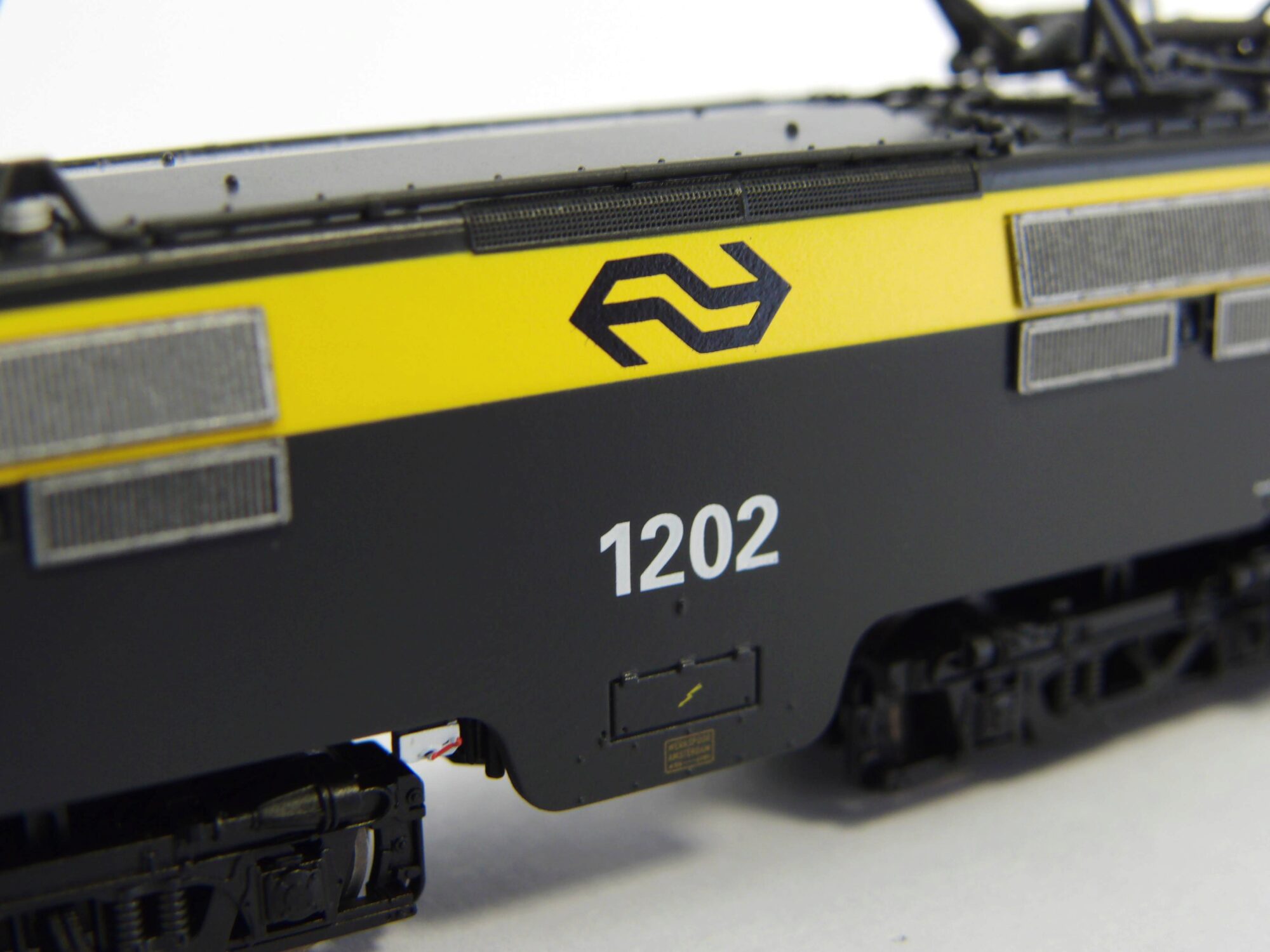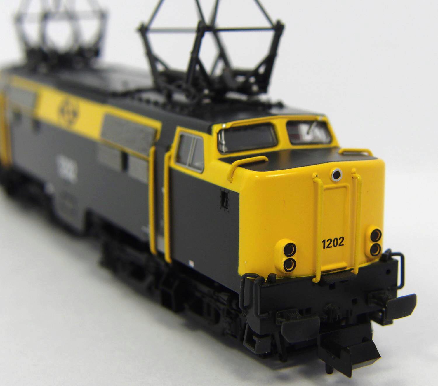 Das PIKO Modell der NS 1200 zeichnet sich durch sehr feine Gravuren am Lokgehäuse und den Drehgestellen aus und entspricht exakt seinem Vorbild. Einen besonderen Blickfang stellen die filigranen und aufwändig ausgeführten Stromabnehmer und die Nachbildung des Daches dar, die alle Details des Originals präzise wiedergeben. Das Modell wurde mit einer Next18-Schnittstelle ausgerüstet und besitzt den üblichen Lichtwechsel rot/weiß. Zusätzlich wurden zwei Räder mit Haftreifen in diagonaler Anordnung mit Haftreifen versehen. Das PIKO Modell besitzt hervorragende Laufeigenschaften und kann problemlos Radien bis herab zu 192 mm durchfahren. Zusätzlich ist das Modell für die Aufnahme eines Sounddecoders mit Lautsprecher vorbereitet und besitzt eine digital schaltbare Führerstandsbeleuchtung.