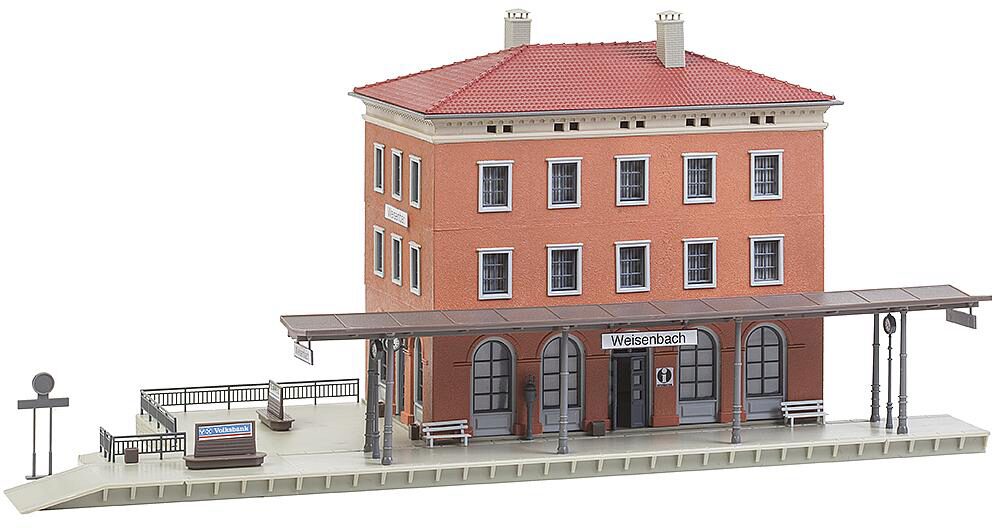 Dreistöckiges Stationsgebäude über längsrechteckigem Grundriss mit überdachtem Hausbahnsteig und beiliegender Bahnsteigausschmückung.