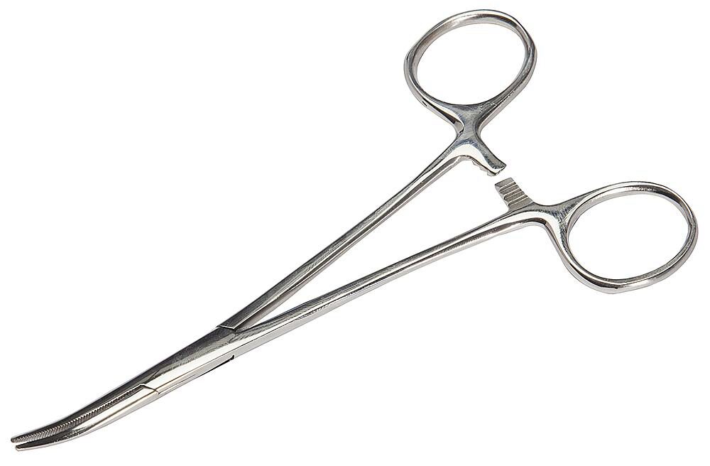 Sicheres und bequemes Halten! Stabile Moskitoklemme aus rostfreiem Edelstahl mit leicht gebogener Spitze, quergerieften Mäulern und mit Rastung.
