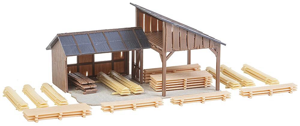 Für Holzstapel und Geräte. Zwei verschränkt gebaute Unterstände mit Trocknungsboden für die Lagerung von Holzstapeln und Geräten. Bodenplatte und verschiedene Bretterstapel liegen dem Modell bei.
