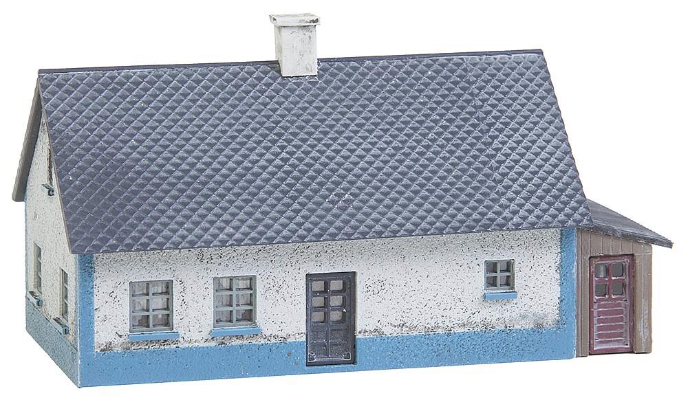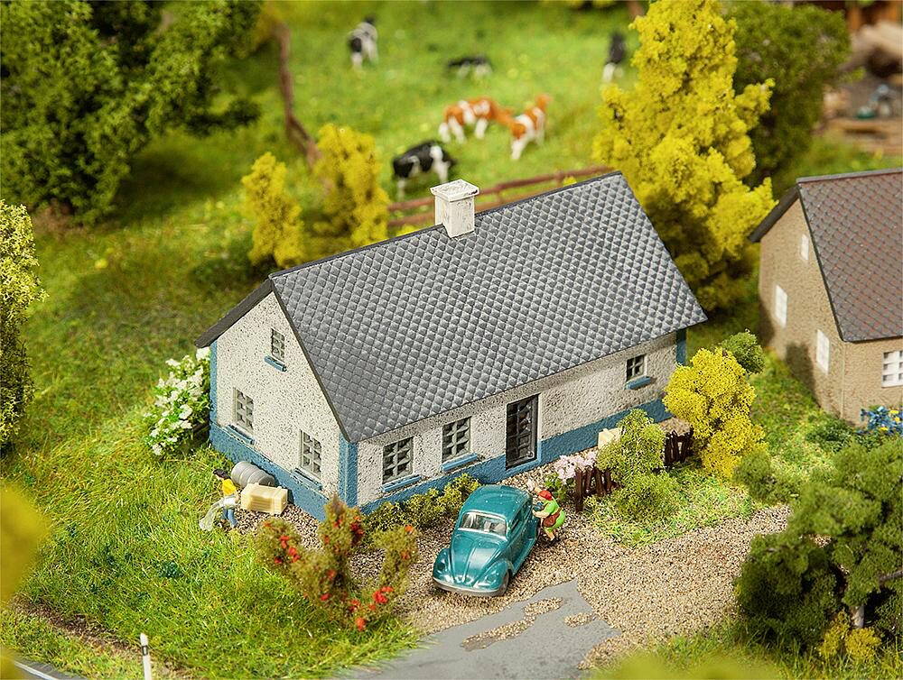Modell eines schlichten, einstöckigen Wohnhauses mit verputzter Fassade, Giebelfenstern und einem Schieferdach. Fensterbänke, Plinthe und Gebäudekanten sind farblich abgesetzt.