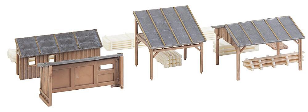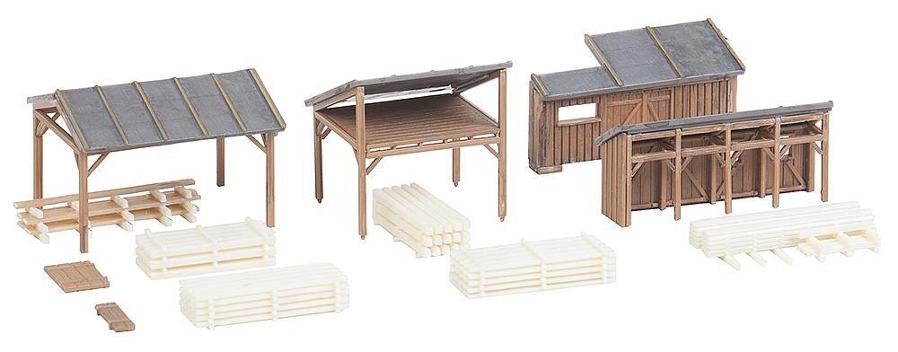 Für Holzstapel und Geräte. Schuppen, Unterstände und Trocknungsboden für die Lagerung von Holzstapeln und Geräten. Verschiedene Bretterstapel liegen zusätzlich bei. Modelle freistehend oder in verschiedenen Anordnungen baubar.