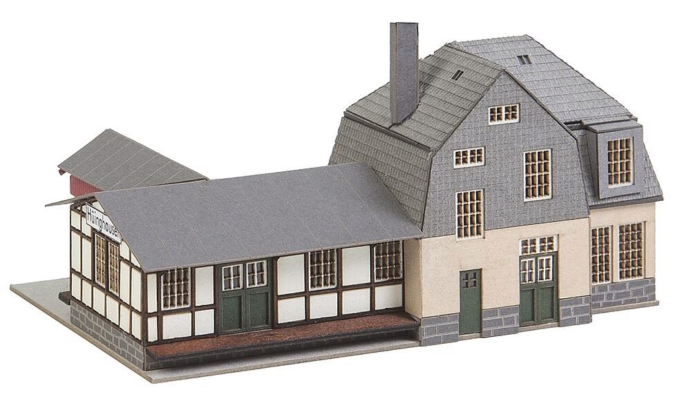 Denkmal! Lasercut-Modell des 1915 in Betrieb genommenen Stationsgebäudes »Herscheid-Hüinghausen« mit einem charakteristischem Mansardwalmdach und seitlichem Fachwerk-Güterschuppen.