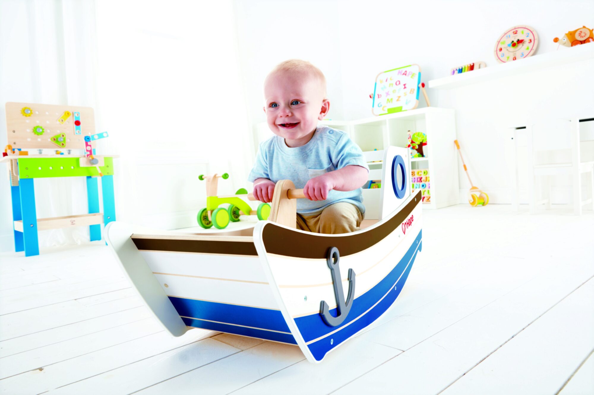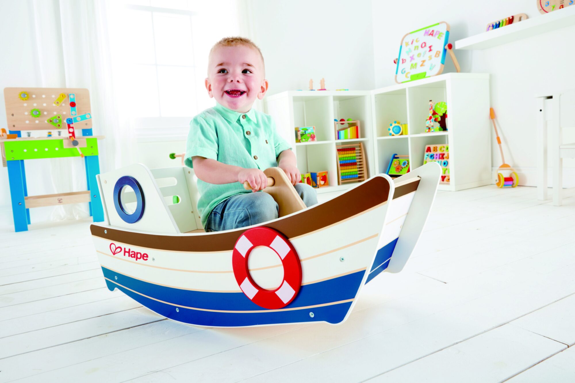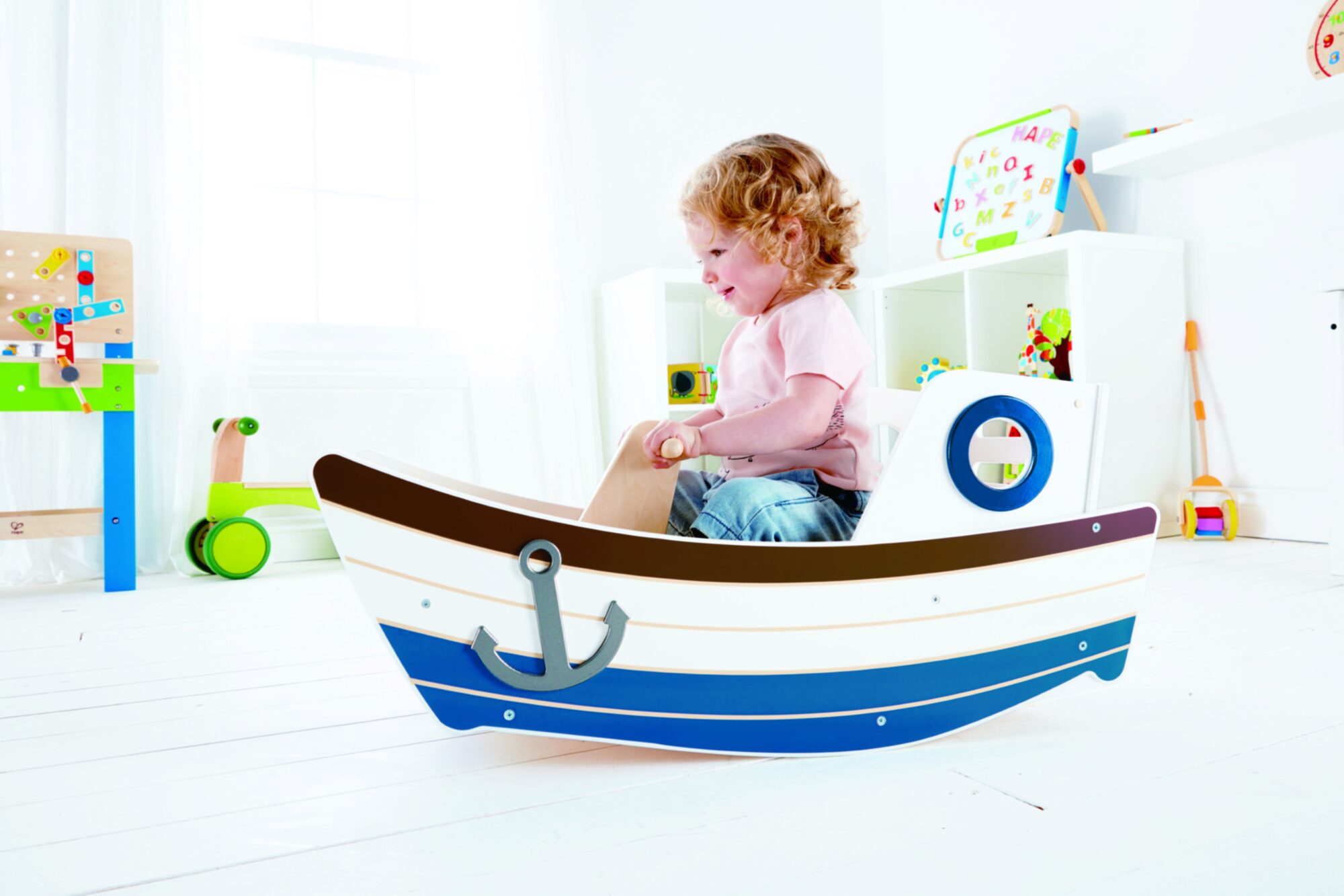 Sitze auf dem Bootsdeck und schaukle vor und zurück, ganz so wie auf den Wellen des Ozeans. Stell dir vor, was du alles für Abenteuer auf hoher See erleben kannst.
