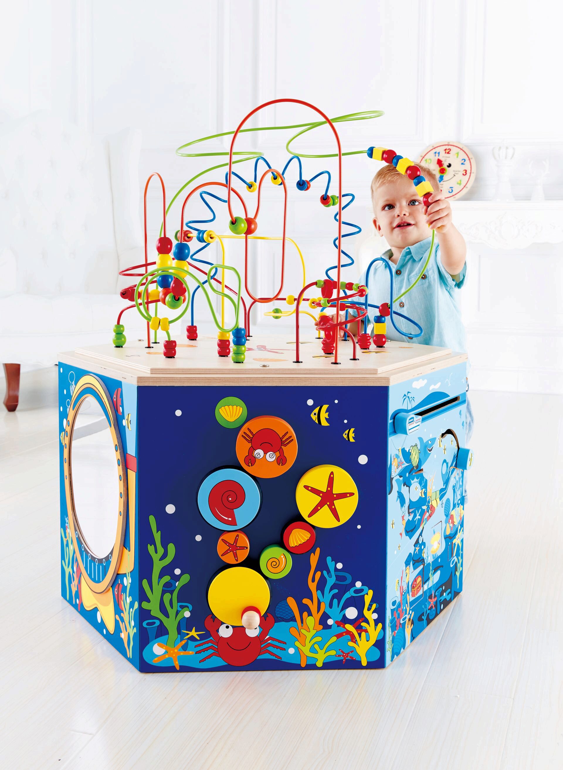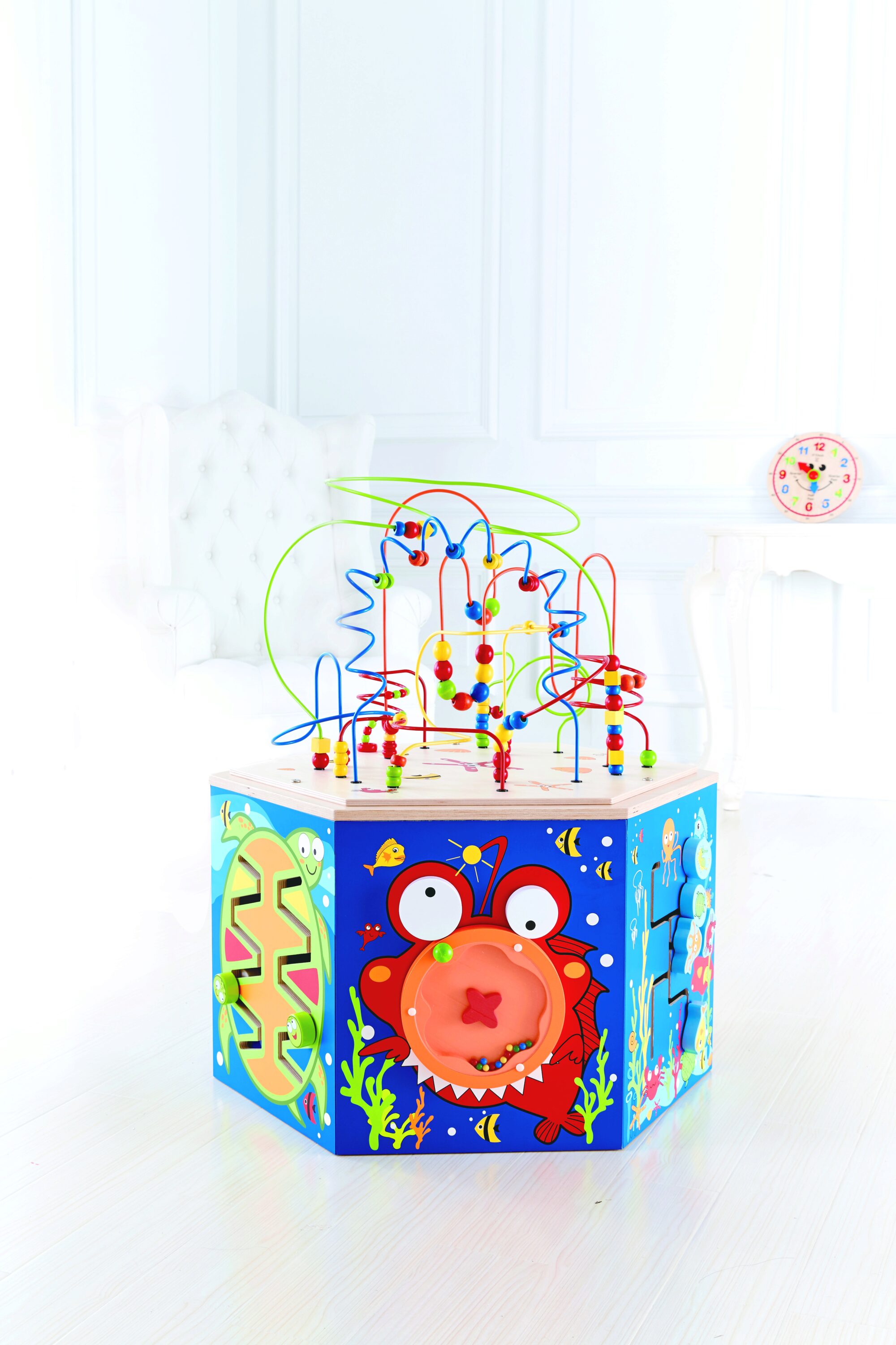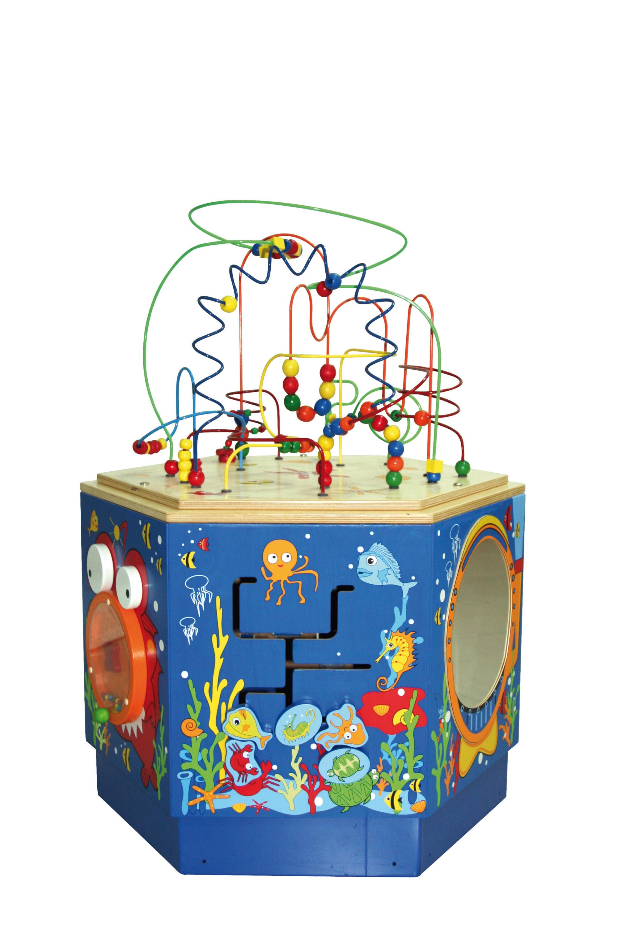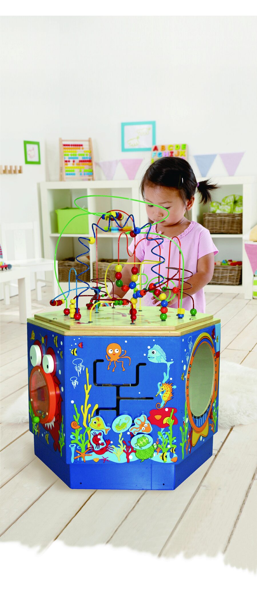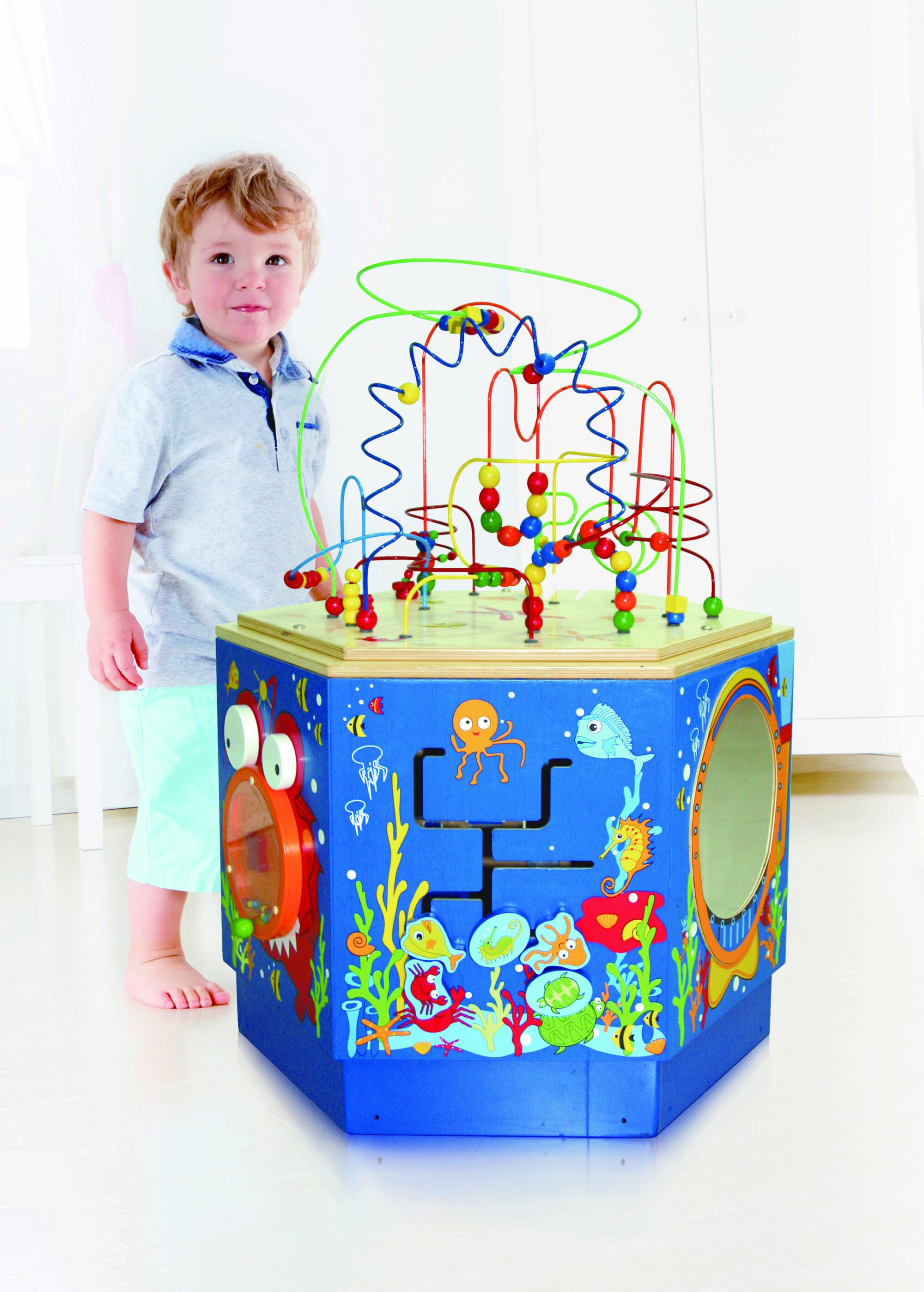 Drehscheiben, Schaltknöpfe, Labyrinthe, Motorikschleifen und andere Spiele bilden ein Meer an Spass bei diesem sechsseitigen Activity-Tisch. Und im ebenfalls vorhandenen Spiegel können sich die Kinder lächeln sehen.