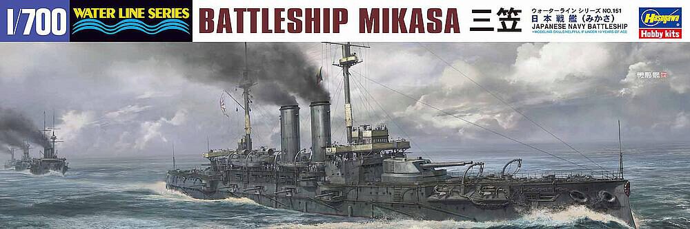 Plastikmodellbausatz eines japanischen Schlachtschiffes aus den 1900er Jahren mit 198 Teilen. Hier die Ausführung als Waterline-Modell. Länge gebaut 184 mm / Breite 45 mm.