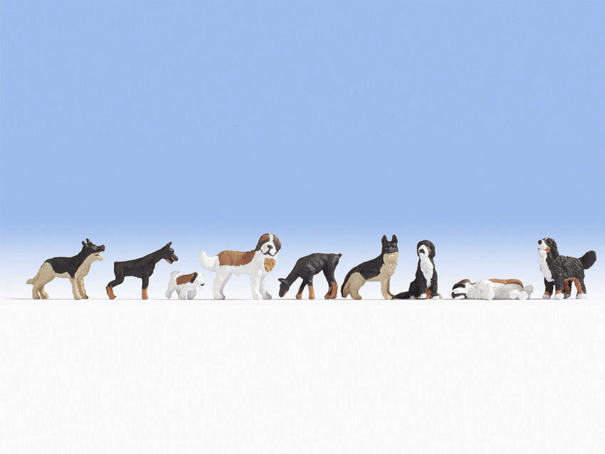 Das Set für die Spur H0 (Maßstab 1:87, ca. 2 cm hoch) umfasst neun Hunde.
