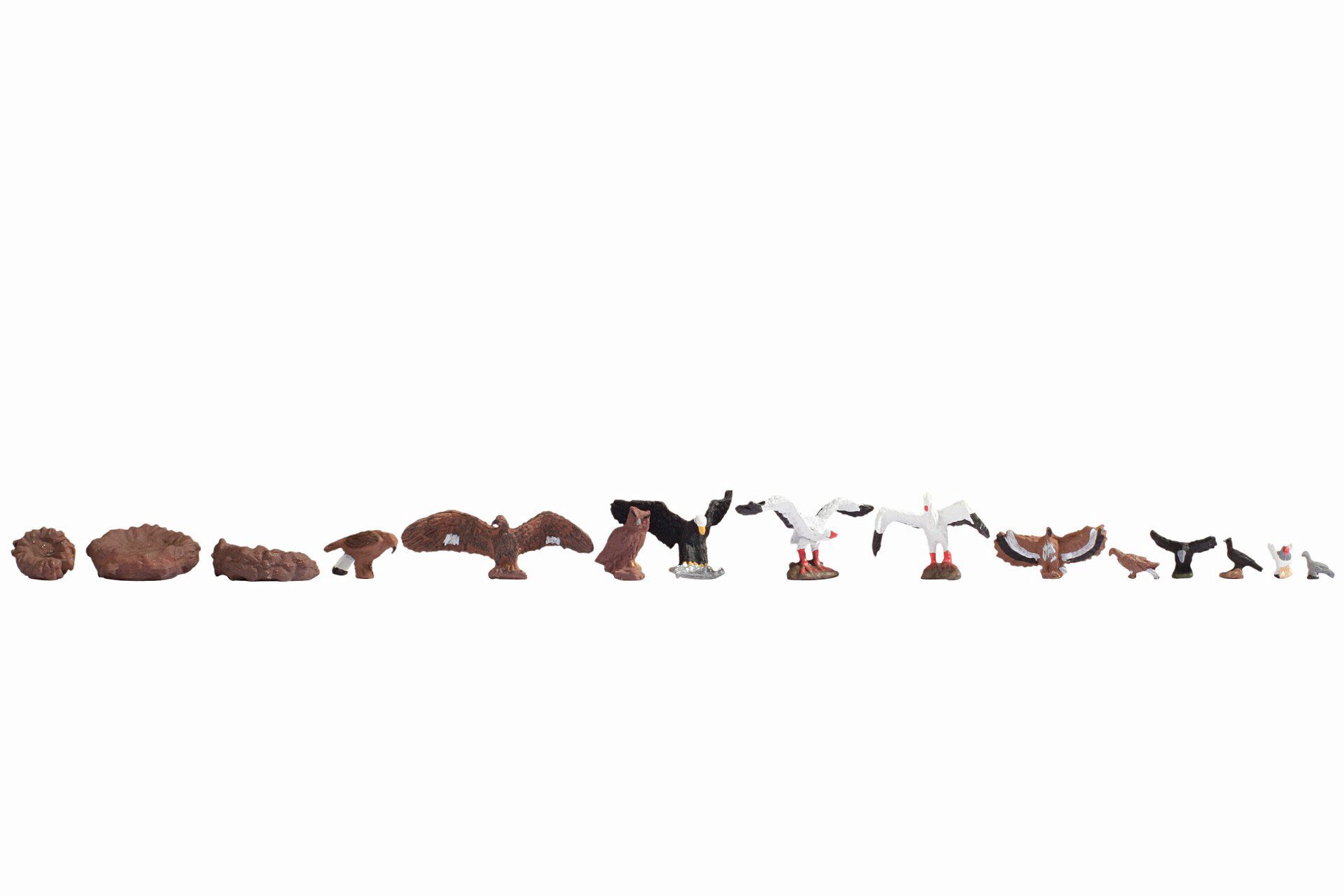 Neben den Raubvögeln wie Weißkopfadler Steinadler, Bussard und Eule befinden sich im Set auch Störche, Raben und Tauben. Weiterhin beinhaltet das 15-teiliege Set 3 Nester für die Adler und die Störche.
