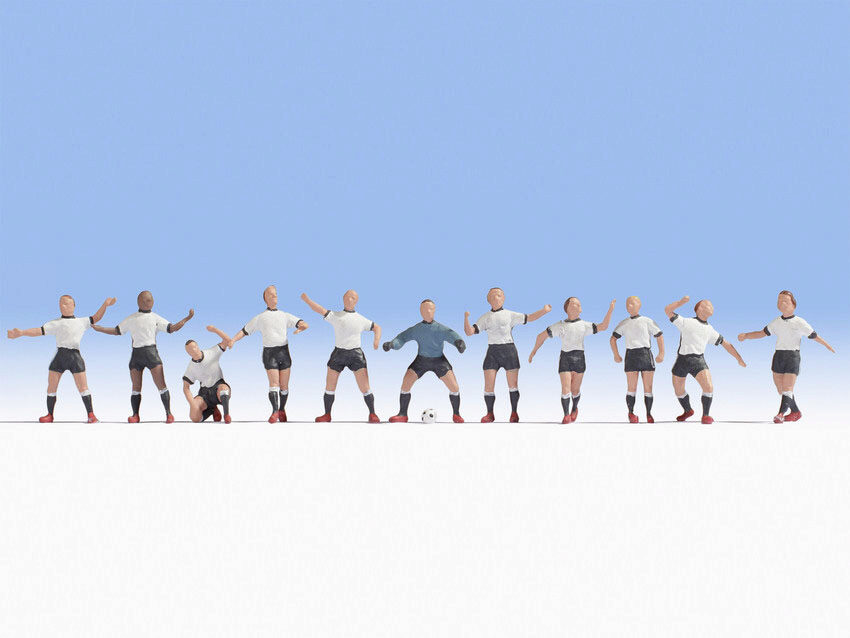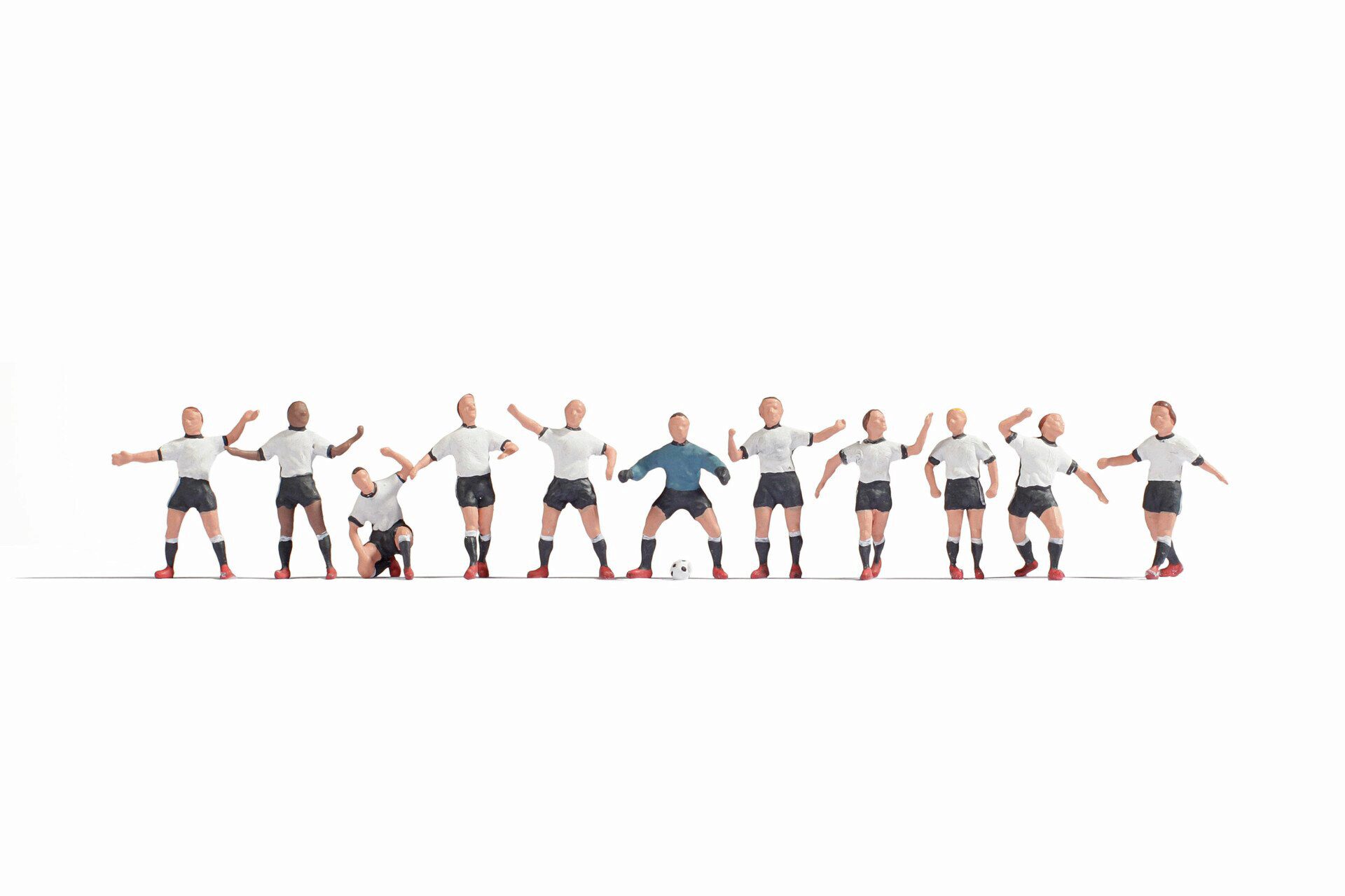 Das Set für die Spur H0 (Maßstab 1:87, ca. 2 cm hoch) enthält ein gesamtes Fußballspiel (10 Feldspieler - Stürmer, Mittelfeld, Abwehr, 1 Torwart und 1 Fußball).