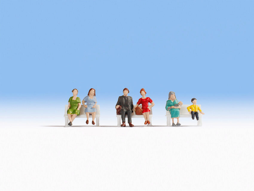Sitzende für die Spur TT. Einfach bemalt zum günstigen Preis! Das Set enthält fünf Erwachsene und ein Kind. Die Sitzende sind realistisch Handbemalt und lassen sich in jede Szene wo sitzende Figuren benötigt werden perfekt einbinden. Die Hobby-Figuren sind einfacher bemalt als die „normalen“ NOCH Figuren. Daher sind die Hobby Figuren die erste Wahl, wenn es darum geht Plätze, Dörfer, Städte, Bahnsteige, Parks, Felder, Waggons und vieles mehr preisgünstig zu bevölkern. Die besonders preiswerten NOCH Hobby-Figuren erkennen Sie an der roten Verpackung.