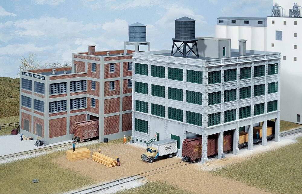 Großes Gebäude in Ziegelsteinausführung mit Wassertank auf dem Dach, Feuerleiter und Laderampe.