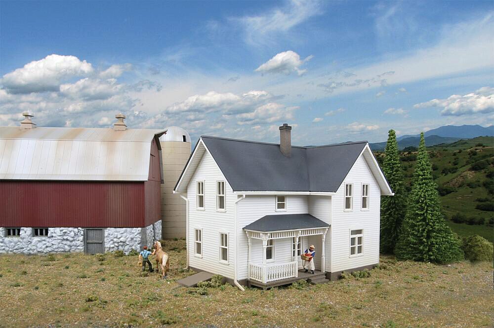 Ländliches Farmhaus in Holzwandausführung und Teerpappedach sowie zweier Veranden.