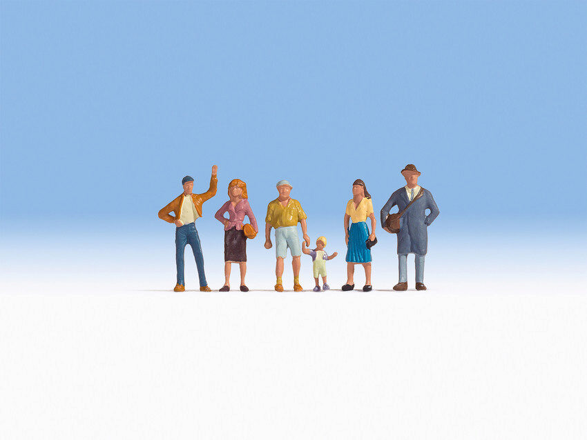 Ein junger Mann in Jeans und Lederjacke steht winkend; eine Geschäftsfrau im Kostüm mit Tasche unter dem Arm blickt nach vorn. Ein Großvater in kurzer Hose und kurzärmeligen Hemd hält sein Enkelkind an der Hand. Eine junge Frau im blauen Faltenrock und gelber Bluse steht betrachtend. Ein großer Mann im grauen Trenchcoat und mit Hut steht wartend. Das Figurenset ist ideal geeignet um Stadt- oder Dorfszenen auf Modelleinbahnanlagen zu dekorieren. Die Modellfiguren sind insbesondere für die Gestaltung von Bahnsteigen und Bushaltestellen geeignet.